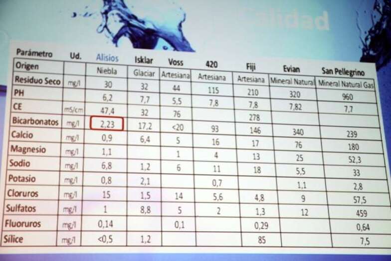 A destacar sobre todo la baja cantidad de bicarbonatos que tiene, y de todo tiene un poco como se ve en los análisis y comparadas con otras aguas del mercado. Con esta agua hemos sacado la primera agua de niebla embotellada a nivel mundial, consideramos que el agua que obtenemos es de mucha calidad, sin detrimento de las otras aguas. El mercado, nuestra agua la ha colocado en el sector Premium. La RAI 5 italiana nos hizo un reportaje y ellos contactaron con un catador de agua D. Faustino Muñoz, sumiller que está considerado entre los mejores catadores de agua en España. Enviada y probadas las muestras de agua y sin salir al mercado ya nos colocó entre una selección de aguas de España y recientemente en una selección de las mejores doce aguas del mundo. Hay un respaldo por parte de técnicos que así lo dicen.