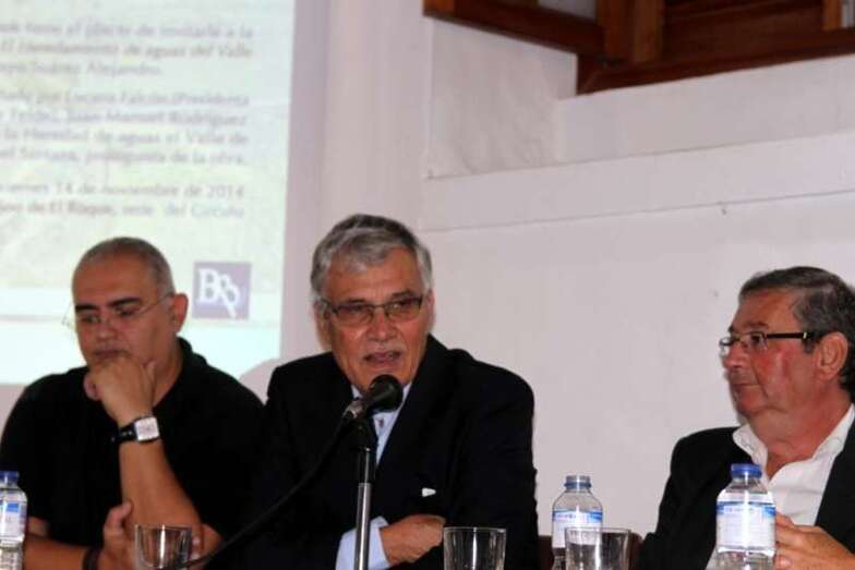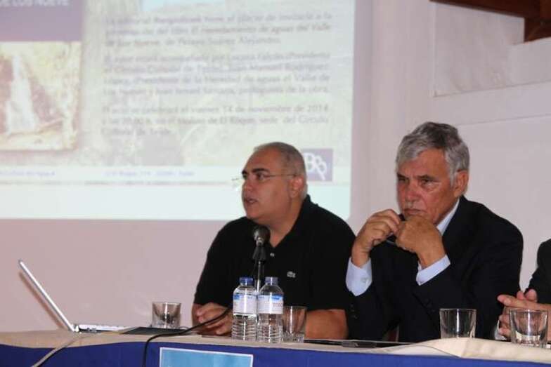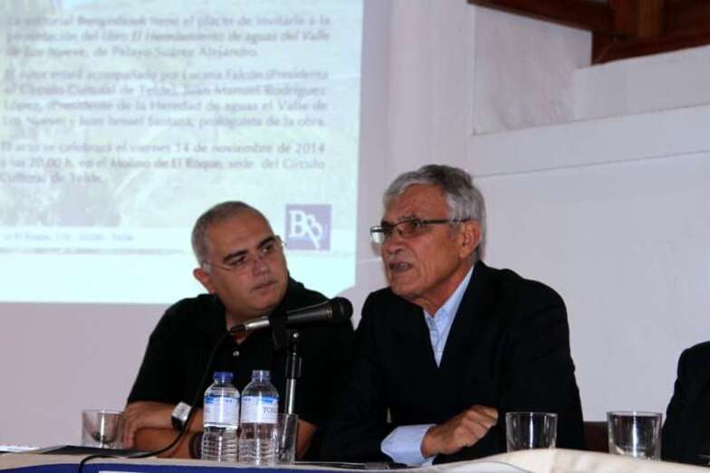 Interviene el presidente de la Heredad de Aguas del Valle de Los Nueve, don Juan Manuel Rodríguez López: “Para mí es un orgullo tener esta joya aquí con Pelayo, lo digo porque lleva varios años intentando escribir esto y desde el 2010 cuando llegué a la presidencia de la Heredad vi la cantidad de documentos antiguos que había y tenían que ser dados a conocer de alguna manera a todos los teldenses para que supieran cual era la historia de la Heredad del Valle de los Nueve, estamos hablando desde 1501 cuando empieza a escribirse la historia de esta Heredad. Quiero darle las gracias a su familia porque segura han tenido que aguantar muchas veces a que Pelayo no salga porque está escribiendo, yo sé que eso lo sufre la familia y quiero darle las gracias a la señora porque es quien ha hecho posible el que hoy estemos entados en esta mesa y tengamos este libro.