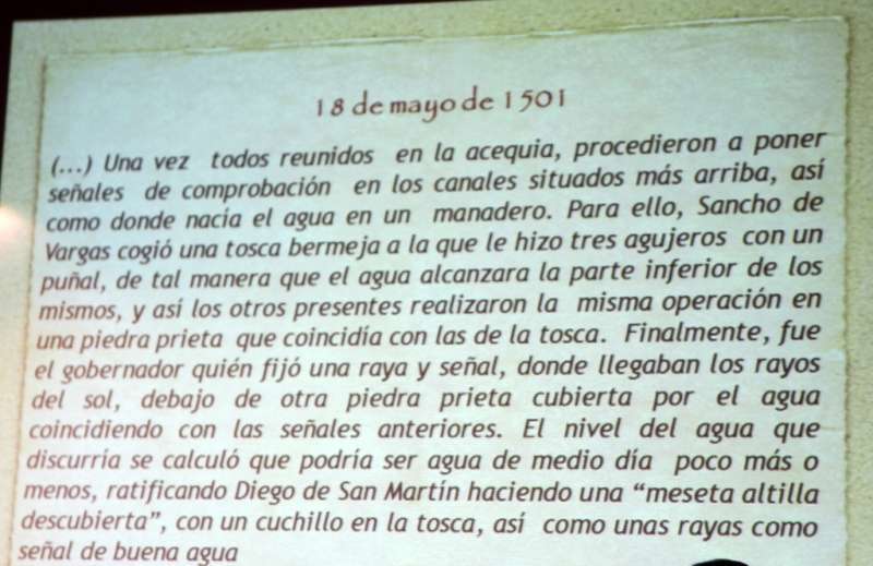 (...) Una vez todos reunidos en la acequia, procedieron a poner señales de comprobación en los canales situados más arriba, así como donde nacía el agua en un manadero. Para ello, Sancho de Vargas cogió una tosca bermeja a la que le hizo tres agujeros con un puñal, de tal manera que el agua alcanzara la parte inferior de los mismos, y así los otros presentes realizaron la misma operación en una piedra prieta que coincidía con las de la tosca. Finalmente, fue el gobernador quién fijó una raya y señal, donde llegaban los rayos del sol, debajo de otra piedra prieta cubierta por el agua coincidiendo con las señales anteriores. El nivel del agua que discurría se calculó que podría ser agua de medio día poco más o menos, ratificando Diego de San Martín haciendo una “meseta altilla descubierta”, con un cuchillo en la tosca, así como unas rayas como señal de buena agua.