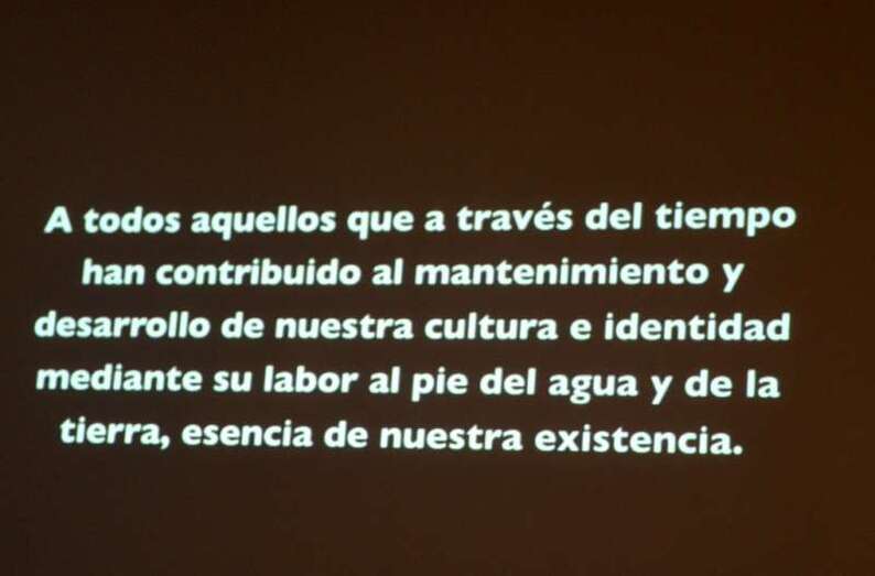 A todos aquellos que a través del tiempo han contribuido al mantenimiento y desarrollo de nuestra cultura e identidad mediante su labor desarrollada al pie del agua y de la tierra, esencia de nuestra existencia.