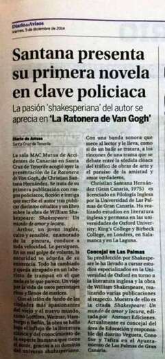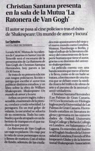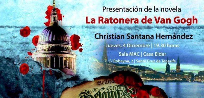 Telde.- El escritor teldenes, Christian Santana, presentará el viernes 19 de diciembre, a las 20.00 horas, en El Casino La Unión de esta ciudad su nueva novela La Ratonera de Van Gogh, después del éxito obtenido tanto en el Gabinete Literario de la capital grancanaria como en la Sala Mac, de Santa Cruz de Tenerife.