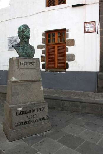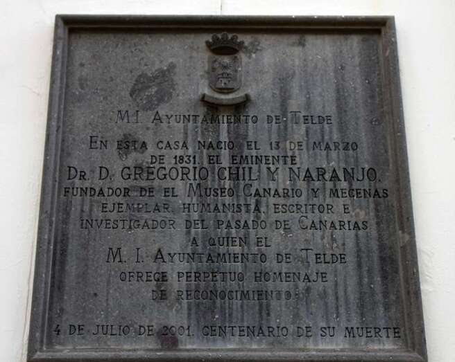 Telde rinde tributo con escultura en busto y placa que recuerdan a la figura del eminente teldense, don Gregorio Chil y Naranjo, gran investigador, científico, una placa situada sobre su casa natal dedicada por los teldenses, expresa: “En esta casa nació el 13 de marzo de 1831 el Eminente Dr. D. Gregorio Chil y Naranjo Fundador de El Museo Canario y Mecenas Ejemplar. Humanista, Escritor e Investigador del Pasado de Canarias a Quien el M.I. Ayuntamiento de Telde Ofrece Perpetuo Homenaje de Reconocimiento. 4 de Julio de 2001 Centenario de su Muerte”. Muchas gracias.