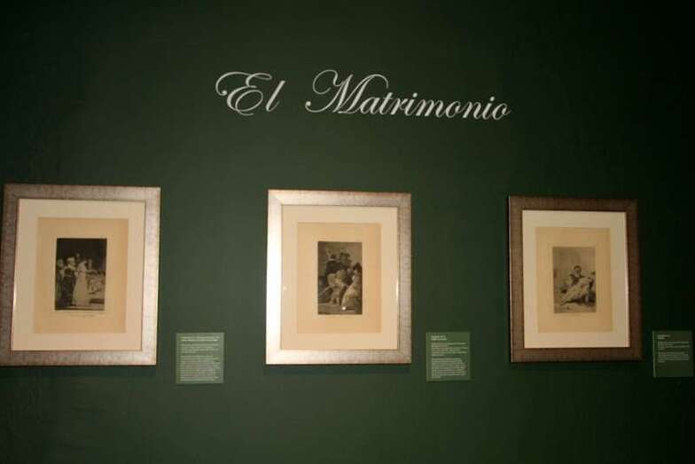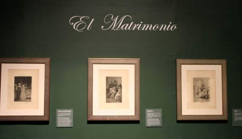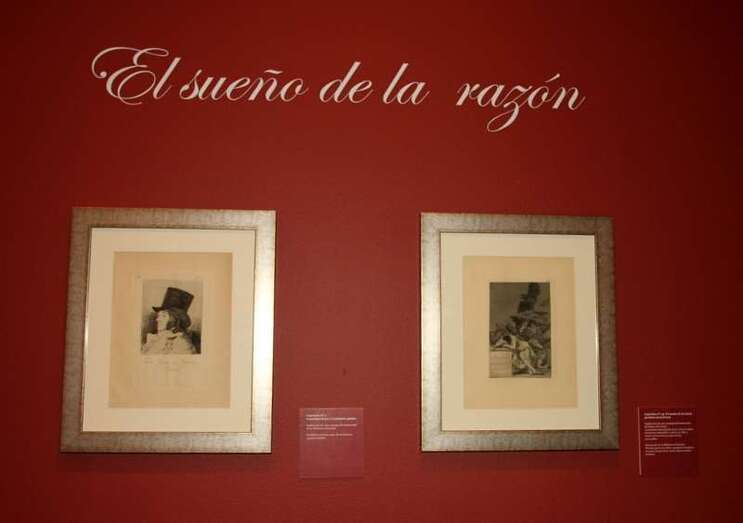 Importante exposición de la Serie Los Caprichos de Goya, muestra 80 de ellos correspondientes a los grabados cuyos motivos podríamos dividirlos en dos partes diferenciadas. En la primera crítica desde la razón y en la segunda parte desde el absurdo, creando unos grabados fantásticos que le sirven para denunciar los abusos sociales. Es, en esta última parte, donde se sirve de recursos de la caricatura italiana, las facciones de los protagonistas están exageradas y en algunos casos añade rasgos de animales a los rostros para resaltar los vicios y las torpezas humanas. Utilizó las técnicas del aguafuerte y el aguatinta apoyando la ejecución de bastantes grabados con el buril y en ocasiones con la punta seca. La serie de 300 ejemplares, estuvo a la venta tan sólo catorce días en una tienda de perfumes y licores de la calle del Desengaño de Madrid muy cerca del domicilio del artista. Tras perder el poder Godoy y los ilustrados, la Inquisición podía tomar medidas contra Goya y atemorizado el artista retiró la serie tras haber vendido 27 ejemplares. Fue en el año 183 cuando decide ofrecer las planchas y los 240 ejemplares disponibles al rey Carlos IV, con destino a la Real Calcografía, a cambio de una pensión vitalicia de doce mil reales anuales para su hijo Francisco Javier. De esta serie se han realizado doce ediciones, la que podemos observar en la exposición es la quinta, estampada por la Real Calcografía entre 1881 y 1886 para la Real Academia de Bellas Artes de San Fernando.
