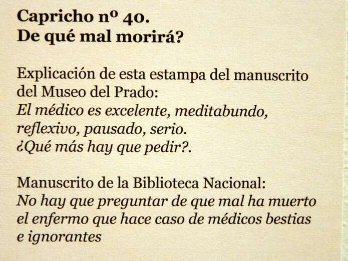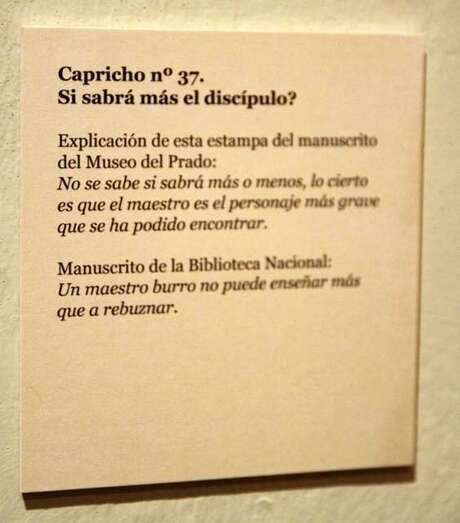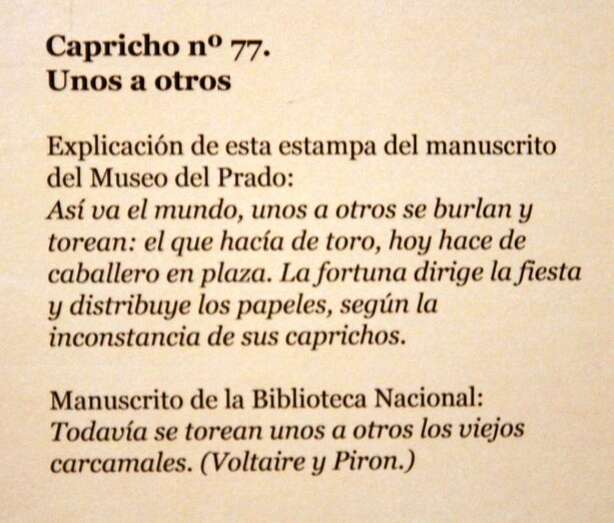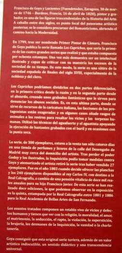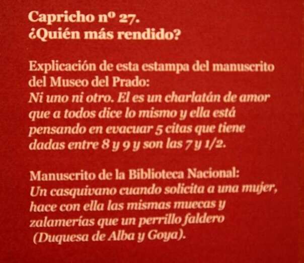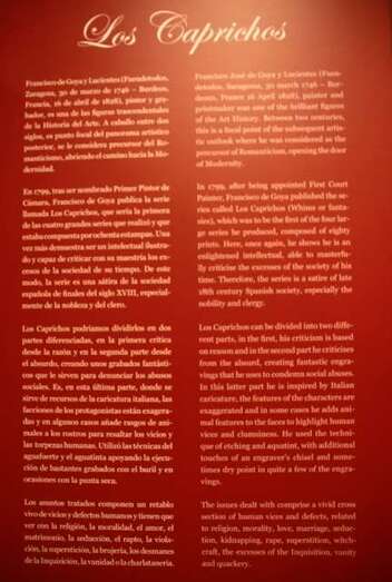 Una verdadera joya del arte, un importantísimo referente artístico de la historia del arte de trascendencia universal que el pintor español logró con su genio transmitir a las generaciones futuras una determinada época de la historia de la España, que heredaba vicios, problemas, dudas, inquietudes, incultura, miedos, generados desde el antiguo régimen, y que el artista expone a modo didáctico y con valor artístico indiscutible aquella realidad, muchos de sus mensajes, críticas y valores aún siguen de actualidad. Que disfruten esta gran exposición Los Caprichos de Goya, que permanecerá abierta al público hasta el 1 de marzo de 2015. Muchas gracias.
