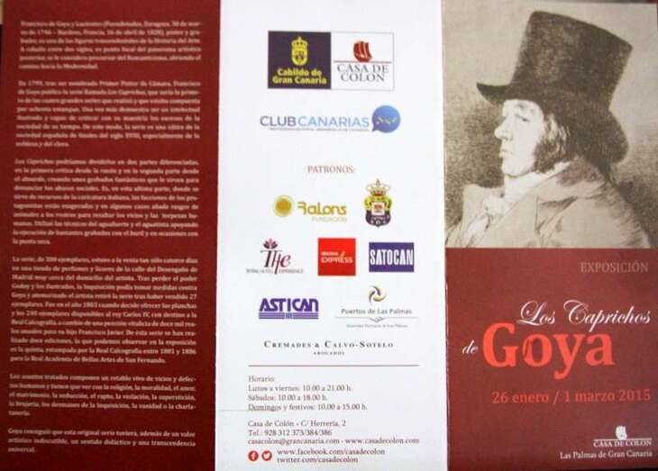 Continúa la dinámica de exposiciones que el Cabildo de Gran Canaria está consiguiendo dentro de su proyecto cultural para Gran Canaria, digno de tener en cuenta por la importancia y trascendencia de las obras expuestas, autores, artistas y significación cultural de los mismos. El lunes 26 de enero en la Casa de Colón de Las Palmas de Gran Canaria, se inauguró la magna exposición de la serie Los Caprichos de Goya, del gran pintor español, universal, Francisco de Goya y Lucientes, ejemplo artístico de las generaciones futuras que gracias a su extensa obra pictórica, de grabados, por la imagen podemos estudiar, entender y visionar la historia de aquella España de finales del siglo XVIII y principios del XIX.