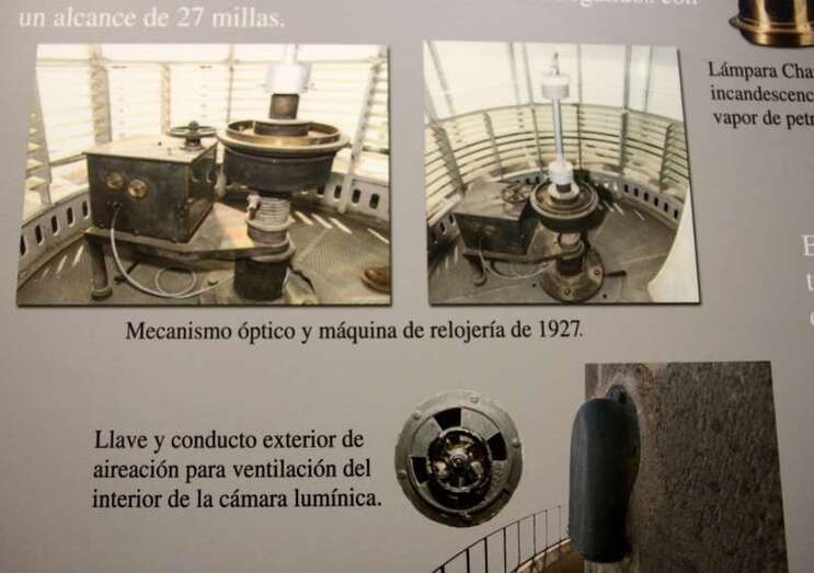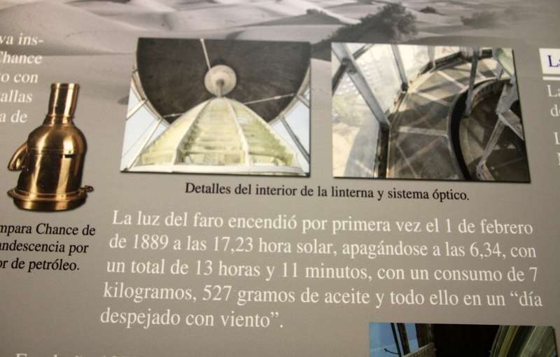 Una Torre histórica: Hay que resaltar que esta torre histórica del faro de Maspalomas está siendo mimada por la Autoridad Portuaria de Las Palmas en todos los aspectos respetando la primitiva maquinaria que tuvo desde su instalación con la cubeta de mercurio. Solo ha cambiado con el paso del tiempo el combustible utilizado para el alumbrado. Primero de aceite de oliva, luego petróleo y ahora la energía eléctrica. Cuenta con dos motores para entrar en servicio si falla esta y que se recuperaron en su día del Faro de Cabo Juby en la vecina costa de África. Una prueba del mimo con que se está atendiendo este Faro de Maspalomas y que nos ha comentado el encargado del Servicio de Faros en Gran Canaria, Nicolás Vega, que ha colaborado de una forma espléndida para el montaje de esta exposición, y a quien tenemos que agradecer profundamente igual que a su compañero José Medina, la colaboración que han hecho sobre todo para facilitar fotografías para el desarrollo de esta conferencia.