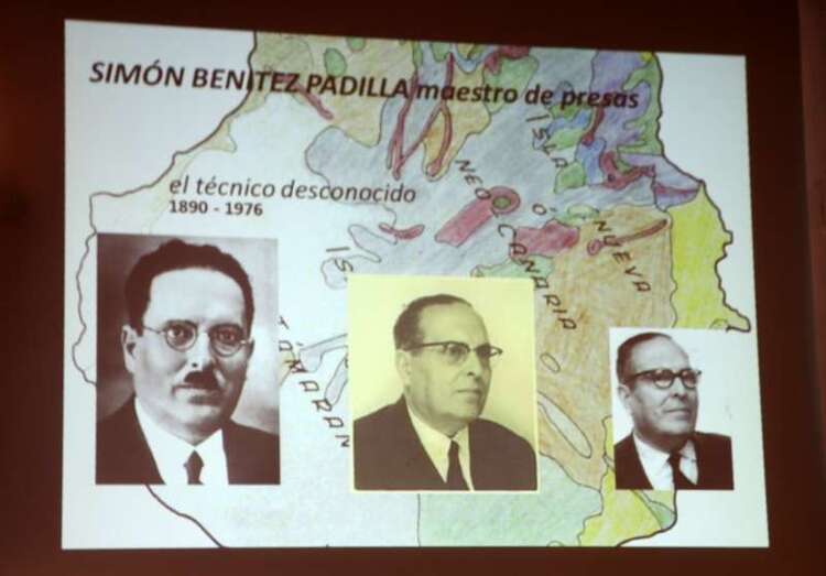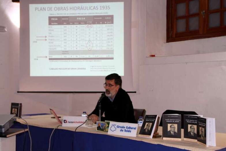 El libro que ha escrito sobre Simón Benítez Padilla nos lo va a expresar en el estudio de las presas, documentos y la vida de esa gran persona que fue don Simón Benítez Padilla, director insular de obras y que nos demuestra que a veces los títulos no lo hacen todo, porque Simón Benítez era ayudante técnico de Obras Publicas, lo que hoy se llamaría un ingeniero de Obras Públicas, Benítez Padilla en la Biblioteca tenía como 30.000 libros. Que una persona acumule tal cantidad de libros es asombroso. Un libro que escribió en el año 1959aunque publicó el año 1947, primero unas memorias y un libro que se volvió a editar en 1992, en edición facsímil: Gran Canaria y sus Obras Hidráulicas, es un libro que recomiendo, asombroso. Era una persona que se preocupaba por todo, experto en geología, de una enorme amplitud de conocimientos.