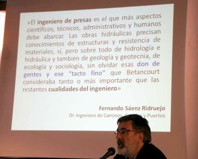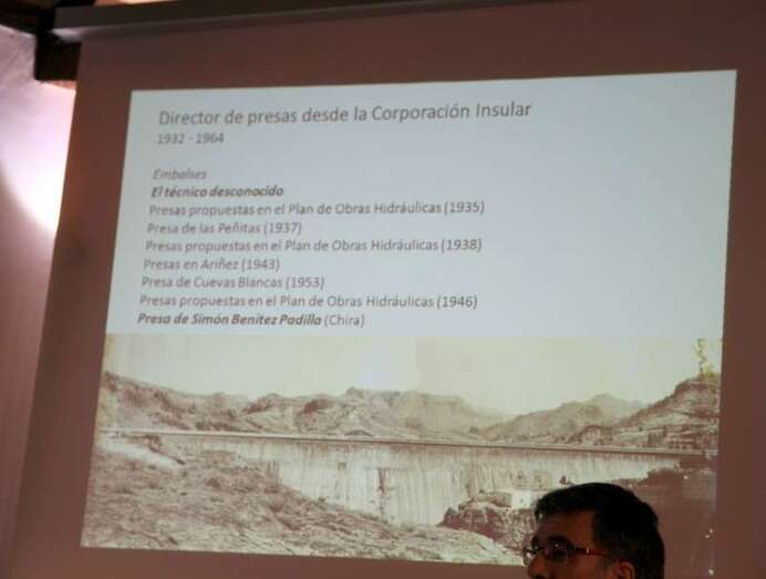 Sentir y respirar la isla por la visión de estas grandes obras, de las presas que calman la sed de los campos. Se lo debemos a uno de sus grandes creadores, a don Simón Benítez Padilla. Enhorabuena al autor de este libro que francamente merece la pena leer, es la historia de nuestro Patrimonio Hidráulico, de nuestras presas y su repercusión en el paisaje, y de la propuesta de futuro que hicieron hombres como aquellos que amaron su isla por encima de todo, conocían bien su tierra, el comportamiento de su climatología, las consecuencias de largos años de sequias, que no se rindieron ante las dificultades iniciales del desafío que presentaba la naturaleza orográfica de la isla, que supieron ver el futuro y lucharon por hacer realidad sus proyectos y obras ante las necesidades urgentes del agua. Ellos lo lograron y Simón Benítez Padilla fue uno de los grandes precursores y realizadores de estas obras, merecedor del reconocimiento que el autor del libro presentado en el Círculo Cultural de Telde, Jaime González Gonzálvez, propone para perpetuar la memoria de Simón Benítez Padilla, maestro de presas. Muchas gracias.