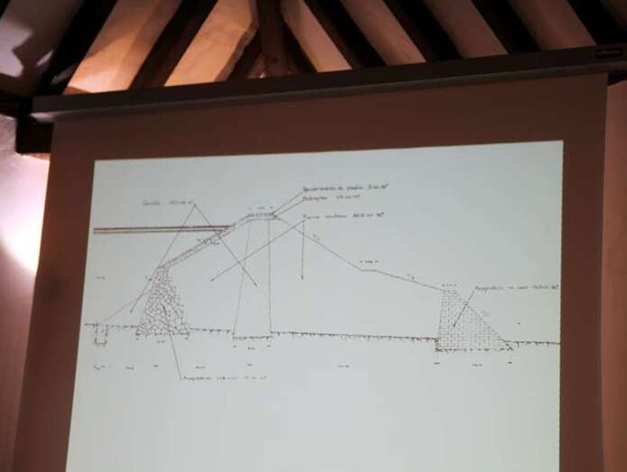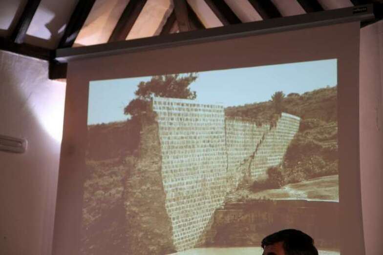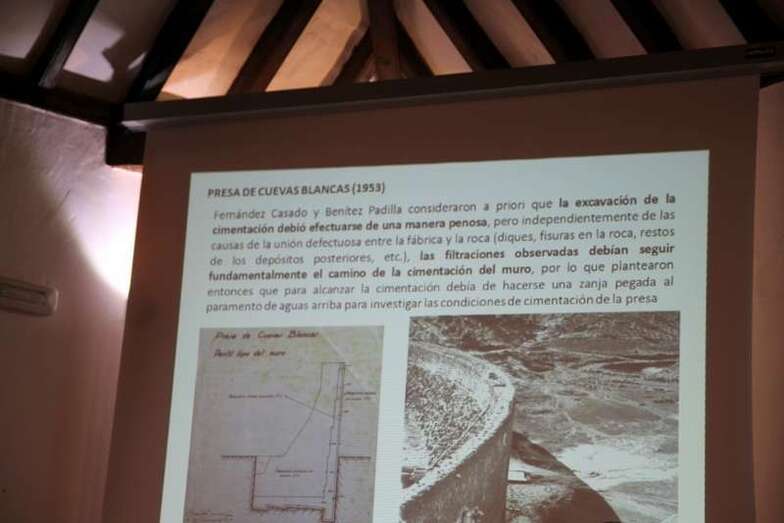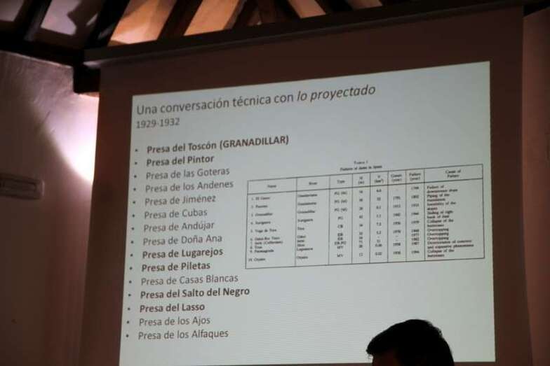 Hay un cuadro antiguo que recoge la rotura de la presa de Granadillar o la Presa del Toscón, en la subida de San José del Álamo. Esta presa se rompió en el año 1934 y fue la primera rotura en el siglo XX en España, causó ocho víctimas y lo que se aporta en el libo es un análisis completo de comentarios y análisis que se recogieron a lo largo del siglo XX con respecto a la rotura y lo cerramos con un documento inédito que ha aparecido en el Archivo personal que guarda la familia d Simón Benítez Padilla, porque apareció el informe que encargó el juez. Simón recogió comentarios del reconocimiento ocular y análisis de la obra destruida, debido a causas originales de menor cimentación profunda en una de las partes, el terreno se agrietó y por un primer llenado completo tiene lugar la rotura por subpresión. En el cauce tenía una cimentación importante de seis metros, pero el empotramiento en su ladera derecho no tenía suficiente cimentación y fue lo que generó la rotura.