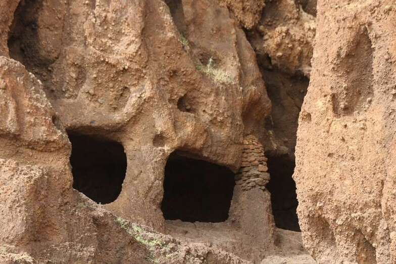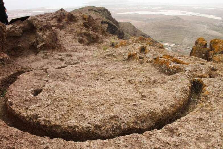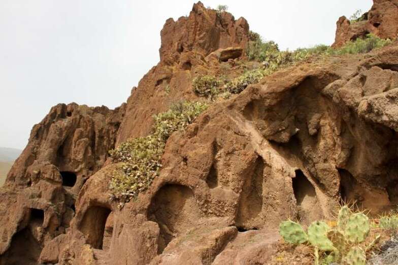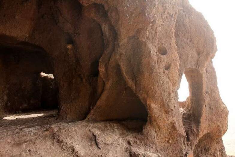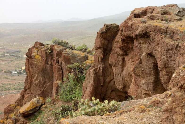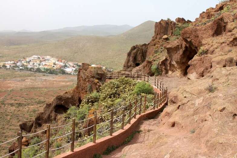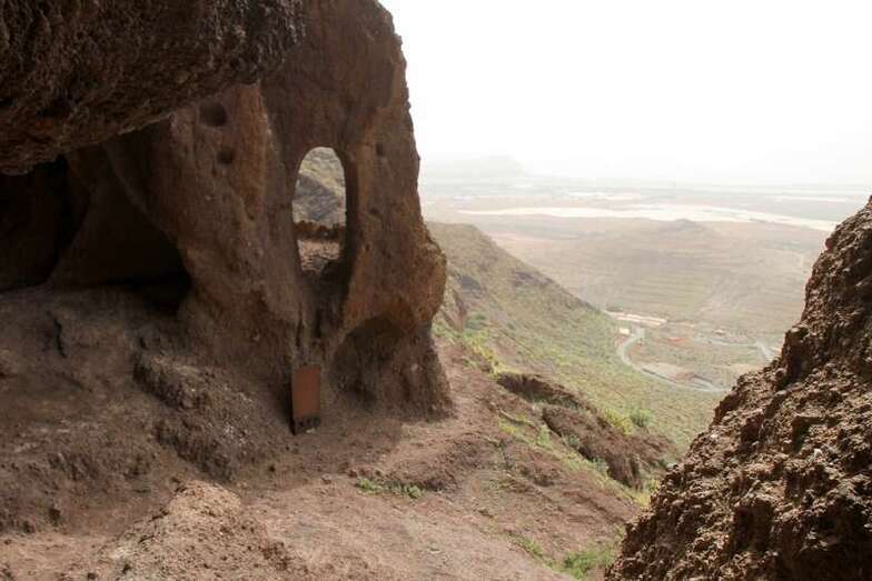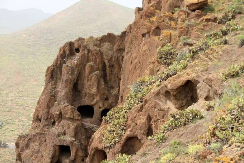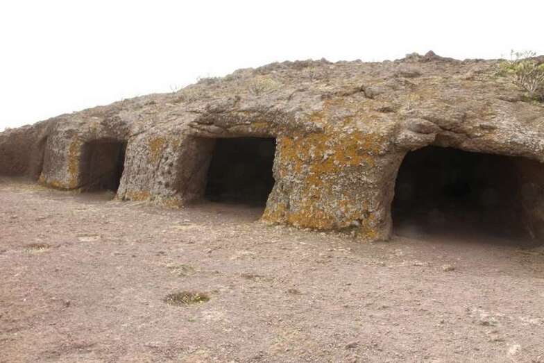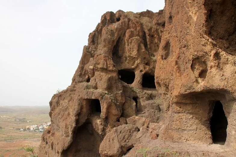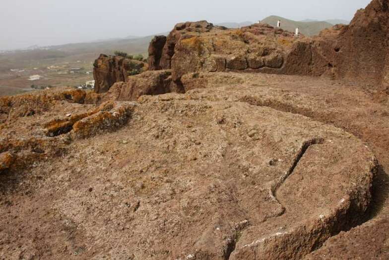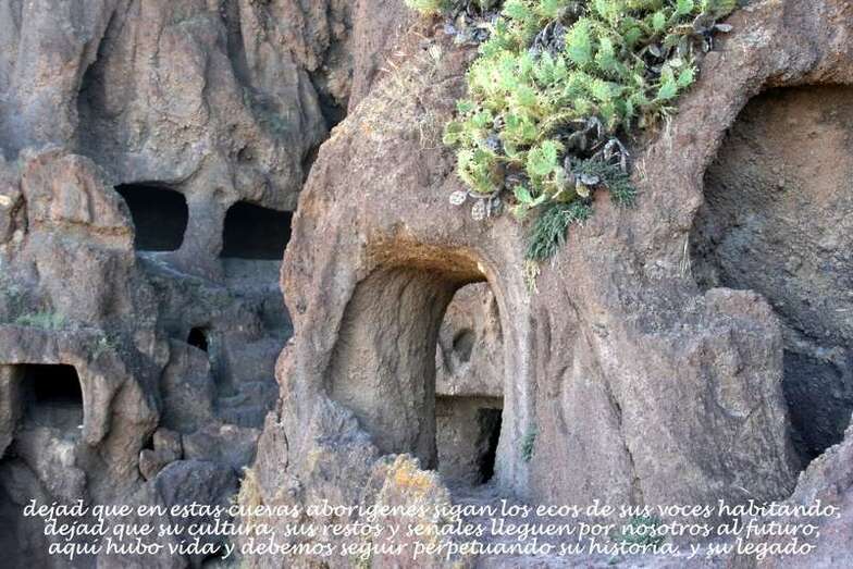 Siguiendo el camino aborigen en dirección al naciente, y en la parte sur del conjunto, se localiza una nueva cavidad artificial, Cueva de los Papeles, en cuyas paredes se grabaron figuraciones de triángulos púbicos, quizás relacionados con ritos propiciatorios. En la cara sur se sitúa el complejo troglodita de Los Pilares, donde se concentran las cuevas dedicadas al hábitat, al almacenamiento……. A cierta distancia (fuera de la ruta) se localiza uno de los pocos ejemplos conocidos de canteras prehispánicas dedicadas a la extracción de ruedas de molino de mano”.