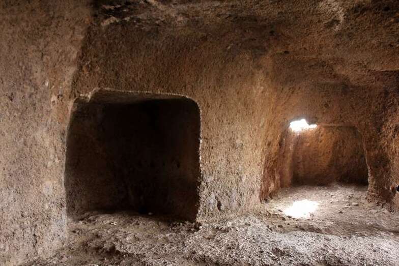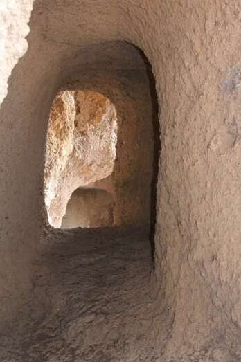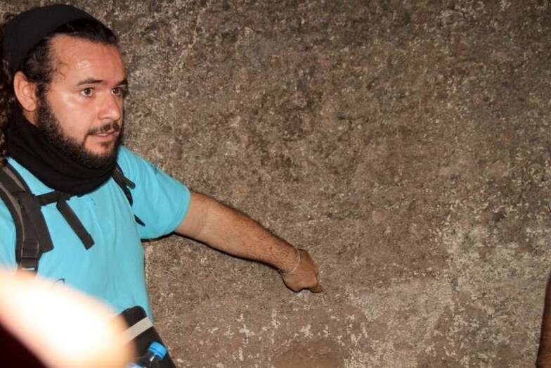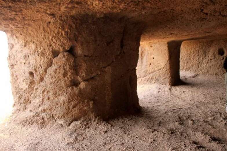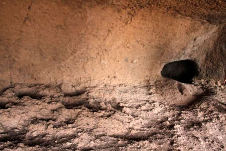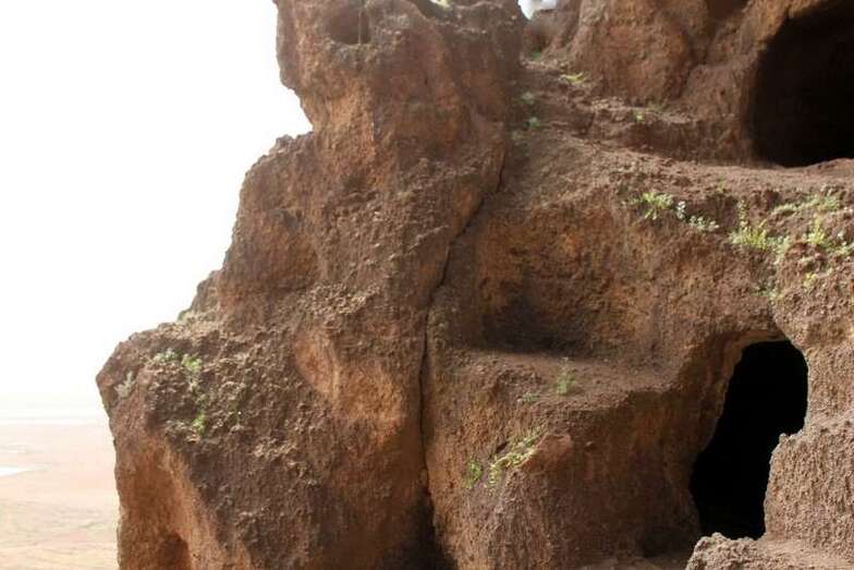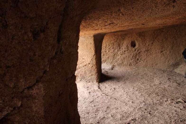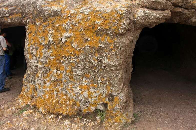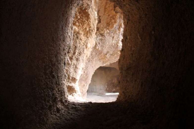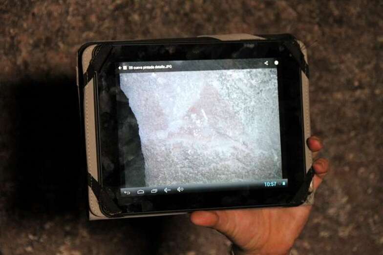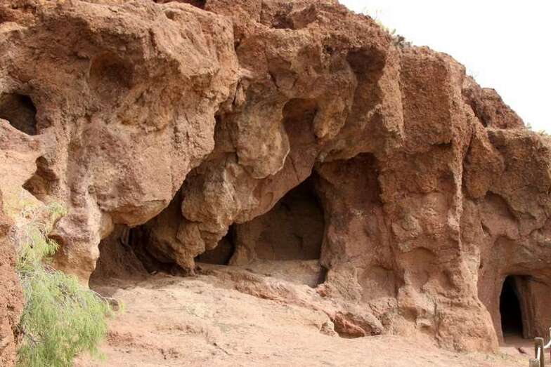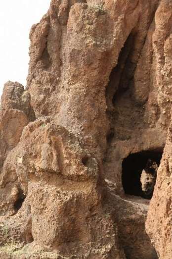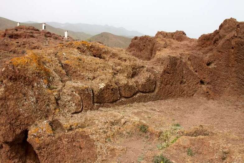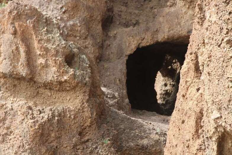 Siguiendo el camino aborigen en dirección al naciente, y en la parte sur del conjunto, se localiza una nueva cavidad artificial, Cueva de los Papeles, en cuyas paredes se grabaron figuraciones de triángulos púbicos, quizás relacionados con ritos propiciatorios. En la cara sur se sitúa el complejo troglodita de Los Pilares, donde se concentran las cuevas dedicadas al hábitat, al almacenamiento……. A cierta distancia (fuera de la ruta) se localiza uno de los pocos ejemplos conocidos de canteras prehispánicas dedicadas a la extracción de ruedas de molino de mano”.