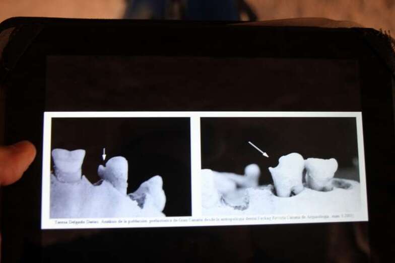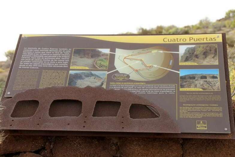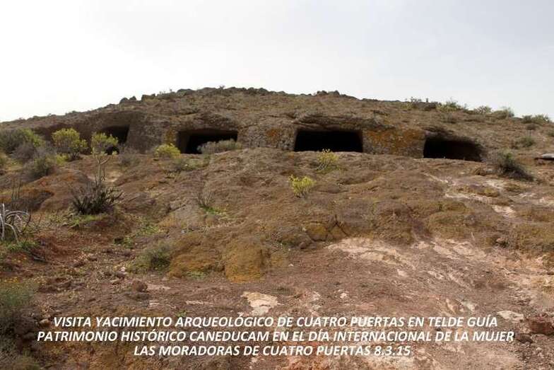 En este camino ascendente hasta la entrada comienza la visita guiada centrada en torno a Las antiguas moradoras de Cuatro Puertas, las mujeres que cumplieron una importantísima misión en aquella sociedad, celebración que el pasado domingo 8 de marzo de 2015 se conmemoró el Día Internacional de La Mujer. Iniciativa del Servicio de Cultura y Patrimonio Histórico Insular del Cabildo de Gran Canaria, visita guiada por personal de la empresa especializada Caneducam. En todo el recorrido Octavio Rodríguez, guía de Caneducam, nos informó ampliamente, de forma amena y bien documentada del poblado troglodita de Cuatro Puertas como uno de los mejores conservados en toda la isla. Cueva artificial labrada a mano por los antiguos canarios, aunque se cree que no es una cueva de hábitat permanente y probablemente está relacionada con los dos lugares de culto de la montaña. En una sociedad estratificada el papel de la mujer toma relevancia entre los antiguos canarios. Muchas crónicas las catalogan como grandes pescadoras, artesanas, se dedicaban a la agricultura, tenían los mismos oficios que los hombres a excepción de un oficio, con evidencia arqueológica, el oficio de sastre. Se sabe por medio del estudio arqueológico de los dientes de estas mujeres la existencia de una escotadura, orificio que creemos que se origina por la repetición de un acto concreto, aplicar la dentadura para ajustar agujas de hueso y materiales naturales, cuero, fibras vegetales.