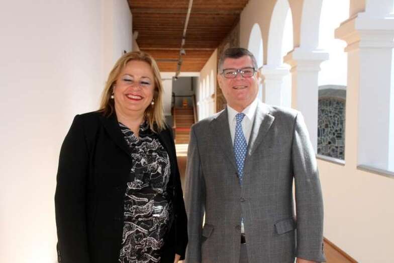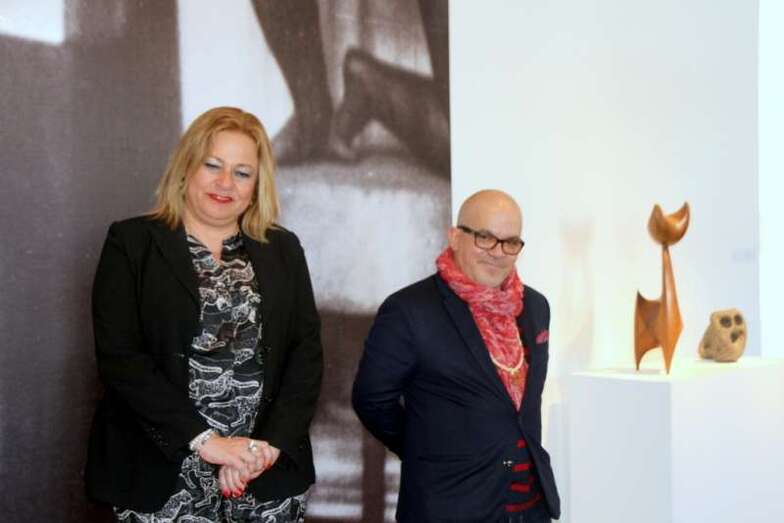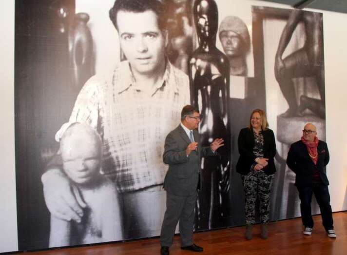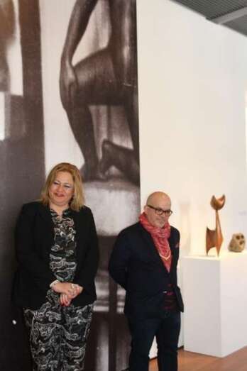 En la sala que da entrada a la muestra escultórica del maestro de la madera, de la piedra, en sus versátiles expresiones de las formas que dio a la materia de la naturaleza, la primera regidora del Municipio de Telde, Mari Carmen Castellano Rodríguez, saluda al grupo de escolares y a las profesoras acompañantes que se han desplazado al Museo para mostrar las numerosas piezas que se exhiben en las salas del Centro San Martín, obras del escultor teldense Plácido Fleitas.