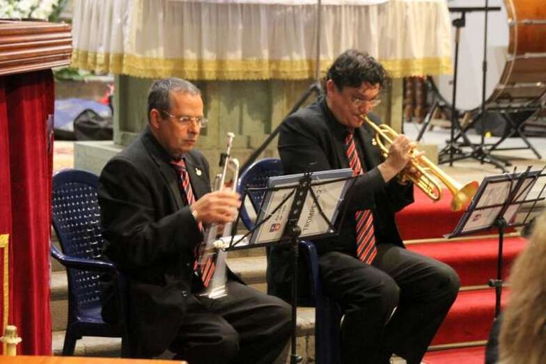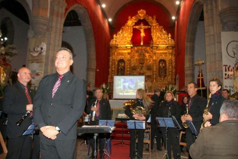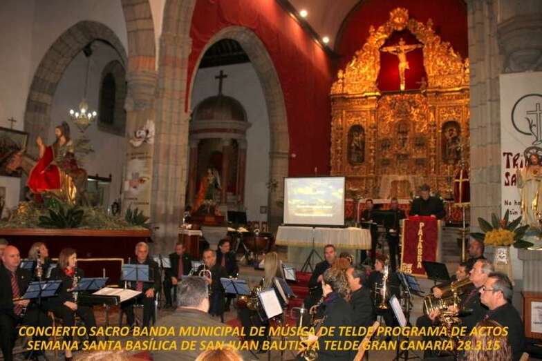 Composiciones de música sacra que la Banda Municipal de Música de Telde ofreció en el presbiterio de la nave central de la Basílica de San Juan Bautista la noche del sábado 28 de marzo, después del oficio de la Santa Misa de la tarde, celebrada por el párroco don José María Cabrera, que cómo siempre, colabora con excelente disposición para que estos actos culturales sean posibles en el incomparable marco escénico de la nave central, bajo el retablo flamenco y el Santo Cristo de Telde desde lo alto presidiendo la cita que los feligreses cada año cumplen por la Semana Mayor teldense y su programa de actos religiosos.