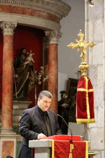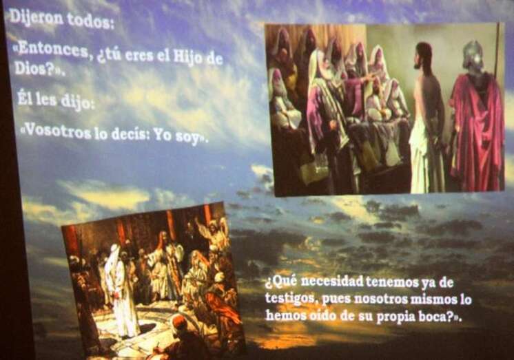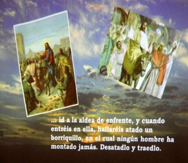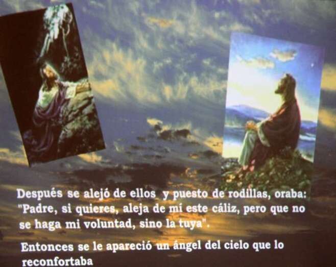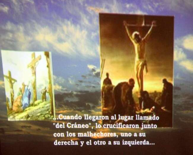 Presentado el programa por Miguel Tejera que agradece en nombre de la Banda de Música la asistencia del público y la colaboración del párroco don José María Cabrera. Tejera da lectura a los ocho textos que dan paso a las proyecciones relativas al evangelio de San Lucas, combinando música y episodios en el que narra la Pasión y Muerte de Nuestro Señor Jesucristo.