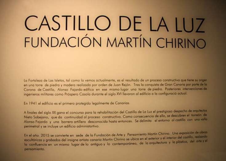 Con fecha sábado, mañana del 28 de marzo de 2015, ha tenido lugar la inauguración de la exposición permanente de la Fundación Martín Chirino, que durante la última semana se ha hecho realidad el poder hacer un recorrido por la obra escultórica abstracta de nuestro insigne artista, que ya admiramos entre aquellas vetustas paredes, muros de mortero, al pie de la Torre de Fajardo, y entre las estancias de la antigua fortaleza del Castillo de La Luz, rehabilitado, con una depurada estructura arquitectónica resultado de la construcción de edificios defensivos, castillos, fortalezas, torres, ideas constructivas traídas de Castilla, aplicadas a las defensas costeras, marítimas, y defensas de esta parte de la antigua Real de Las Palmas, el Castillo de La Luz al pie de las Isletas, la ciudad empieza a tomar conciencia de sus defensas, sobre todo con los antecedentes de ataques corsarios, berberiscos, piráticos,  Pieter van der Does (1599), Drake, etc.