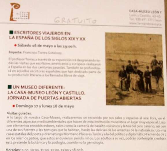 La Casa Museo León y Castillo de Telde dependiente del Cabildo de Gran Canaria con tal motivo entre sus actos programados ha organizado dos conferencias muy interesantes basadas en dos conceptos el ecológico y el literario. José Manuel Espiño Meilán, profesor, escritor, ecologista autor de varias obras al respecto expuso una charla ecológico-literaria el pasado viernes 15 de mayo con el título: Gran Canaria la isla mágica. El profesor Francisco Torres Gutiérrez, director de los encuentros literarios Café con L y del Club de Lectura Los Placeres de Montiano, que se vienen celebrando en la institución museística teldense, expuso la tarde del sábado 16 una interesante ponencia sobre la literatura y los viajes: Escritores viajeros en la España de los siglos XIX y XX.