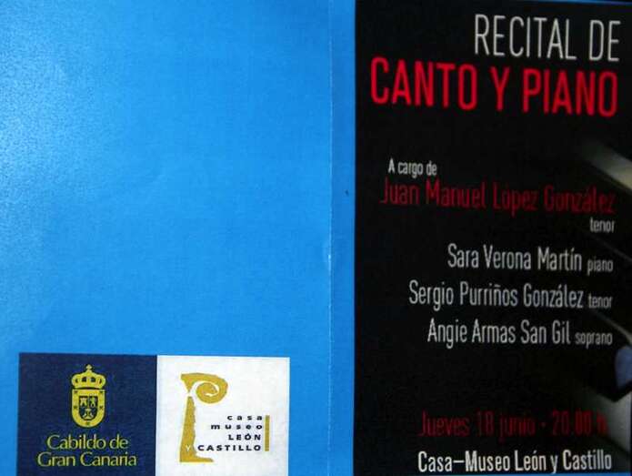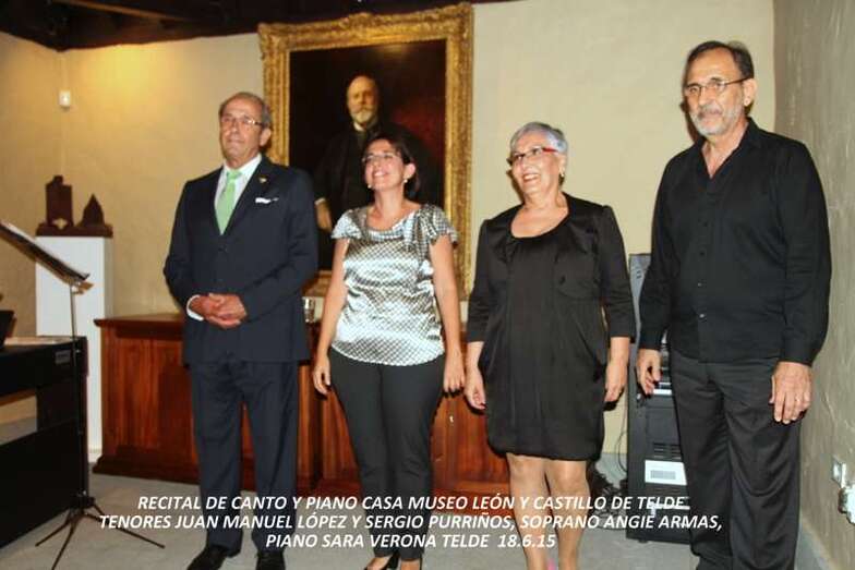 El público asistente que llenó el salón de actos de la Casa Museo Léon y Castillo de Telde disfrutó de una magnífica velada musical la tarde noche del jueves 18 de junio, con un amplio y variado repertorio de composiciones para recital de canto y piano interpretados por el tenor teldense, Juan Manuel López González, el tenor Sergio Purriños González y la soprano Angie Armas San Gil, temas seleccionados de las mejores composiciones de romanzas, arias, canciones, boleros, que la pianista, profesora de piano, Da. Sara Verona Martín, hizo que llenaran de armonías, perfectos acordes y solos para piano, la estancia de esta Casa Museo de bellísimas melodías y voces, logrando sus intérpretes un éxito total, testimoniado por las ovaciones, aplausos y reconocimientos por el buen hacer de cada solista en su especialidad vocal y musical.