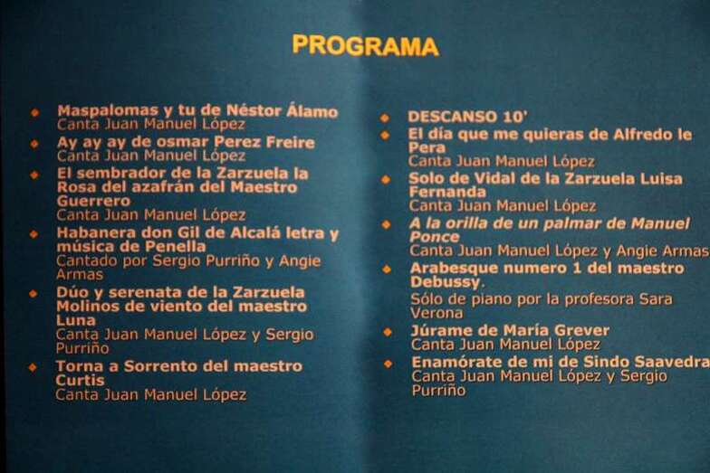 Tengo que agradecer a todos los intérpretes, pianista, tenores, soprano, que han trabajado mucho para presentar esta noche el programa que tienen en sus manos, canciones, de las más recientes hasta las más tradicionales de la lírica y zarzuela, que forman parte del acerbo cultural de España y de Europa. Escuchar su trabajo gracias al esfuerzo aplicado, sobre todo, en este programa que presentamos para deleite de todos ustedes. Muchas gracias”.