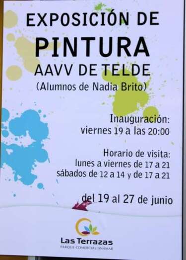 El viernes 19 de junio a las 20.00 horas se inauguraba la Exposición de Pintura de Asociaciones Vecinales de Telde (AAVV de Telde), que componen la agrupación de alumnas y alumnos de la profesora de pintura Nadia Brito, muestra artística que exhibe sus obras en el Centro Comercial Las Terrazas del Parque Comercial de Jinámar de Telde.