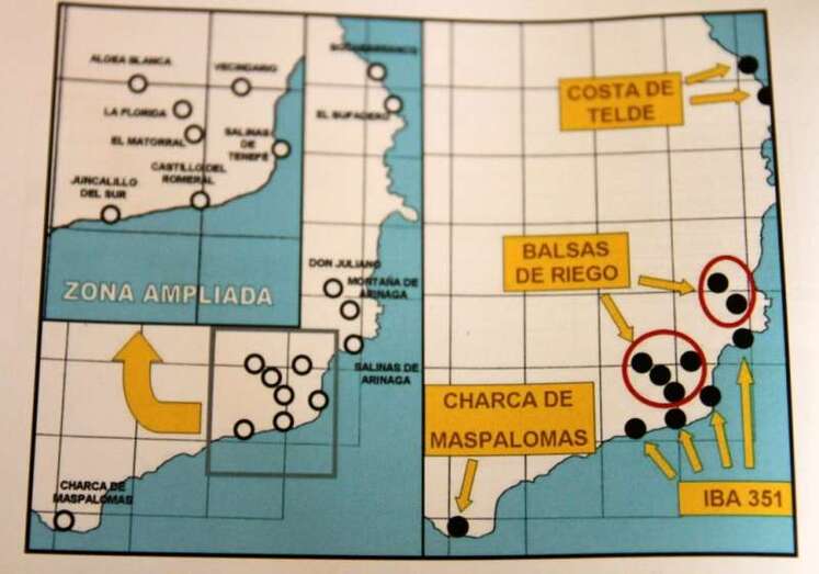 Las Islas Canarias no presentan espacios extensos que puedan considerarse humedales de importancia internacional que atraigan a gran número de ellas. Los territorios con condiciones adecuadas para este grupo de especies se caracterizan por su limitada superficie, su fragmentación y el grave deterioro presente en los mismos, además de la posible escasa productividad de las fuentes de alimentos para mantener numerosas poblaciones. Por ello los censos se caracterizan por los reducidos números de ejemplares observados durante la realización de los mismos. En la costa destacan los valores obtenidos en áreas de rasas intermareales que se producen en los períodos de bajamar donde los encharcamientos presentes en las plataformas rocosas atraen a grupos de individuos de estas especies, especialmente limícolas”.