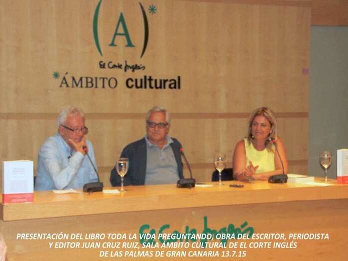 La tarde del lunes 13 de julio el periodista canario Juan Cruz Ruiz presentó el último trabajo periodístico, recopilación de entrevistas en Toda la vida preguntando en la Sala Ámbito Cultural de El Corte Inglés de Las Palmas de Gran Canaria. En esta ocasión el periodista entrevistador es entrevistado, el mismo autor, a cargo de dos reconocidos profesionales periodistas radiofónicos: Dulce María Facundo de Punto Radio Las Palmas, y Jorge Alemán de Unión Deportiva Radio, que presentando la extensa obra y experiencia profesional de Juan Cruz Ruiz, inician una serie de preguntas claves para entrar en la biografía, profesión, particularidades de su personalidad y trabajos a lo largo de su dilatada carrera colmada de premios y reconocimientos. Presentado por Pablo Sabalza Ortíz-Roldán, coordinador del programa cultural de esta entidad, expresa la bienvenida presentando al escritor, e informa de la agenda que se ofrece a la entrada, para el mes de julio, de la Sala Ámbito Cultural de El Corte Inglés de Las Palmas de Gran Canaria.