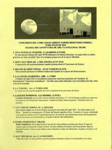 Telde.- El Coro Amati del Círculo Cultural de Telde presentó anoche, a partir de las 20.00 horas, un renovado repertorio en el concierto que ofreció en la Iglesia del Santo Cural de Ars, sita en la plaza de Clavellinas. El recital estuvo patrocinado por TELDEACTUALIDAD, que ofrece imágenes de la actuación.