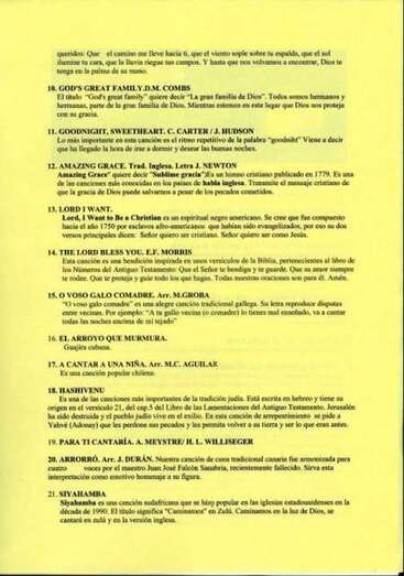 En esta ocasión, el grupo dirigido por Narmis Hernández brindo al público asistente un repertorio dividido en cuatro partes: la primera estuvo dedicada a las canciones tradicionales españolas, le siguió una selección de piezas religiosas de gran calidad , como el Ave verum de Mozart y el Panis Angelicus; continúo con espirituales negros muy arraigados en EEUU y finalizó con temas de distintas partes del mundo como El arroyo que murmura, Hashivenu ,etcétera. Cerró la actuación con la alegre canción sudafricana Siyahamba.