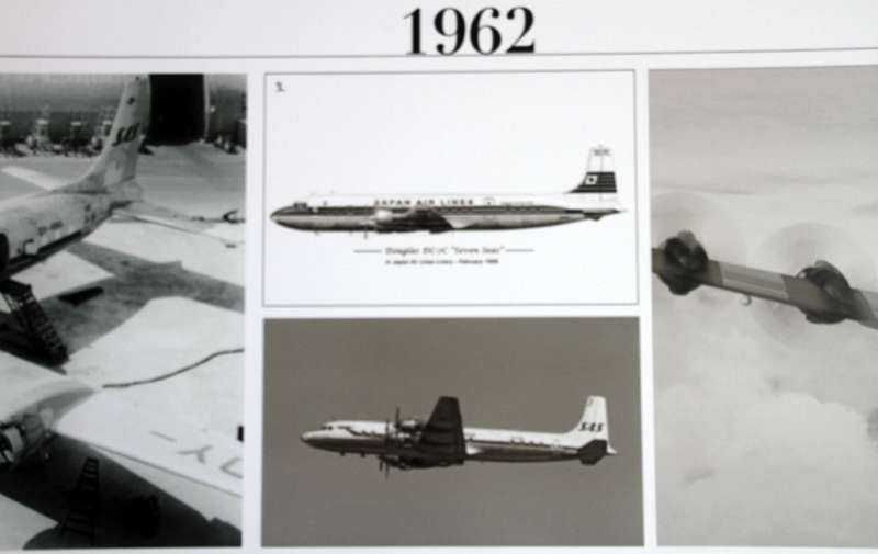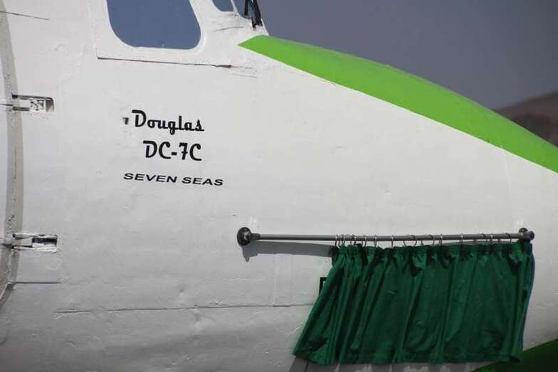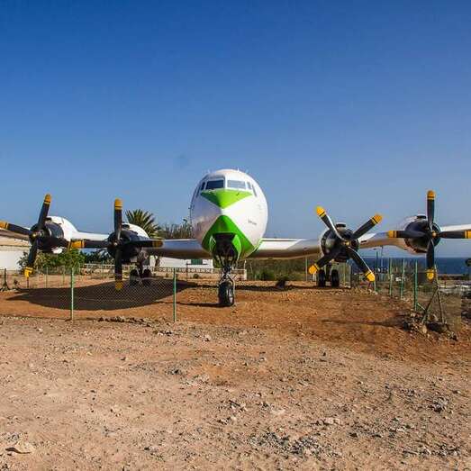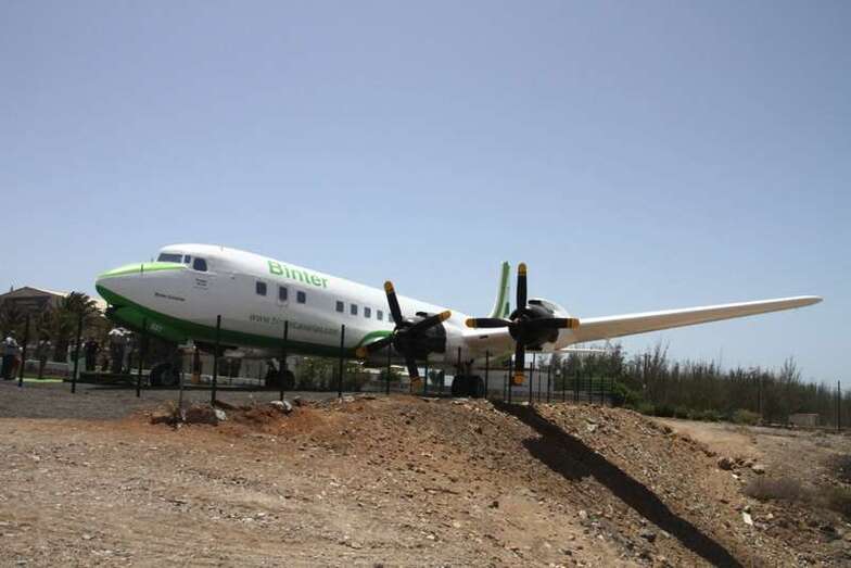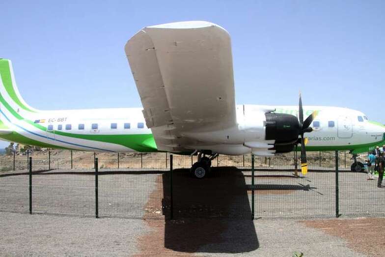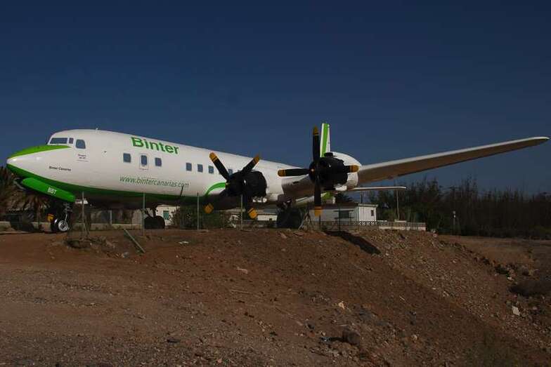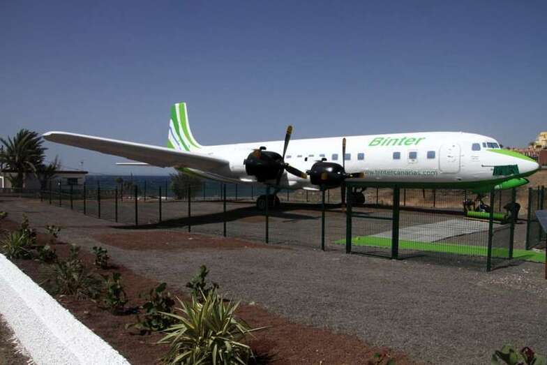 El avión expuesto, modelo DC-7C, fue el último de una serie de 350 unidades de este tipo de aeronave de hélice. En 1958 la compañía Swissair adquirió el aparato y lo destinó a rutas sin escalas en Estados Unidos. En 1961 fue vendido a Scandinavian Airlines Service (SAS), pero no llegó a entrar en servicio hasta que lo adquirió Japan Airlines (JAL), para las rutas Tokio-San Francisco-Tokio-Los Ángeles, vía Honolulú. En 1965 el avión fue vendido a Spantax (compañía chárter española) con matrícula EC-BBT, y fue destinado a rutas de medio alcance, uniendo Madrid y las Islas Canarias. También operó rutas más largas entre los países nórdicos y los archipiélagos de Baleares y Canarias. Permaneció en activo hasta 1976 y fue dado de bajo en 1978. Finalmente, un año más tarde fue donado al Real Aeroclub de Gran Canaria, constituyendo su llegada un gran acontecimiento en la isla. Ahora, el avión adquiere los colores de la compañía aérea que ha hecho posible su profunda restauración, Binter.