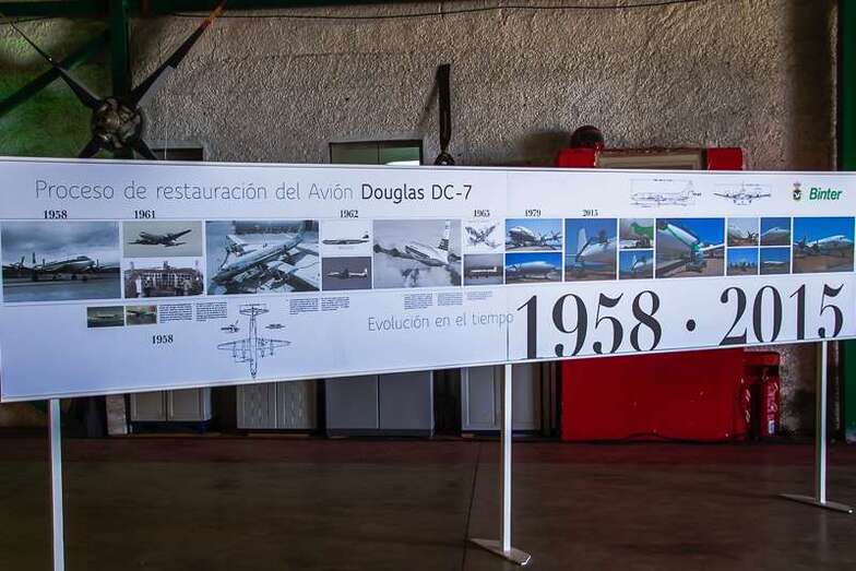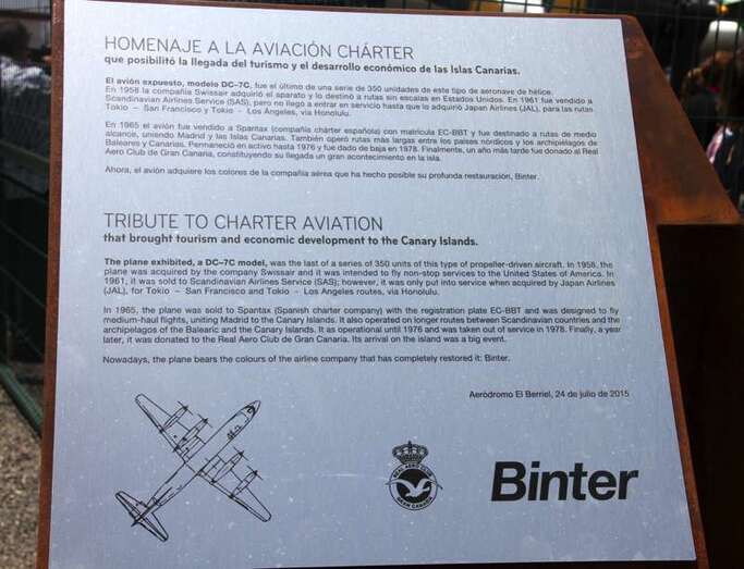 Un amplio díptico informativo editado por Binter y el Real Aeroclub El Berriel de Las Palmas de Gran Canaria, expone en una de sus secciones que figuran en la exposición, 1979-2015 El proceso de Restauración: “El avión DC-7C estuvo volando desde 1965 en la desaparecida compañía de vuelos chárter Spantax. Fue un avión extraordinario, muy seguro y llevó a cientos de miles de pasajeros y carga a toda Europa y África. Se fabricaron cerca de 350 unidades de este tipo de avión de hélice. Fue en 1979, cuando la compañía aérea Spantax donó este aparato al Real Aeroclub de Gran Canaria.