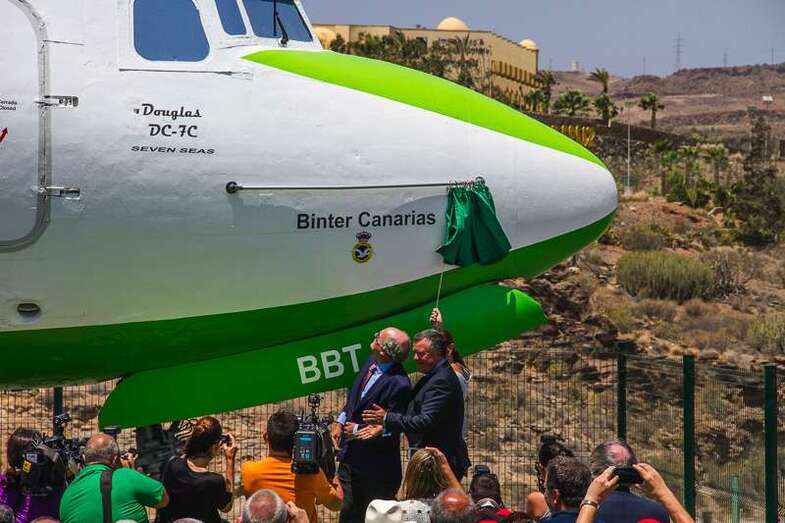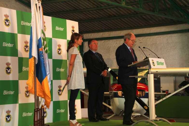 Acto de inauguración al que asistieron el presidente de Binter, Pedro Agustín del Castillo, la Consejera de Turismo del Cabildo de Gran Canaria, Inés Jiménez Martín, y el presidente del Real Aeroclub de Gran Canaria, Fernando Moreno Hernández, personalidades, técnicos, pilotos, instructores, relacionados con el mundo aéreo, comercial y deportivo, medios de comunicación que asistieron a este evento para dar testimonio de un momento de la vida e historia de la aviación en Canarias. Abierta la cortinilla que dejaba ver definitivamente el nuevo nombre de la emblemática aeronave, Binter Canarias, que se ha encargado de la restauración desde una de las empresas de mantenimiento, SATI (Servicios Aerotécnicos Insulares, S.L.), de la aerolínea canaria BINTER.