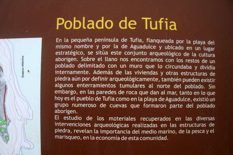 En la pequeña península de Tufia flanqueada al sur por la playa del mismo nombre y al norte la de Aguadulce, se sitúa estratégicamente el poblado aborigen, un grupo de viviendas concentradas en dos núcleos: una en el centro y otra en lo alto del promontorio hacia el sur, un grupo de cuatro viviendas construidas con las mismas características y morfología del resto estructural del poblado. Destaca una superficie cuadrangular de esquinas redondeadas como espacio diferenciado de gran perfección constructiva realizado con cantos rodados del lugar, con unas dimensiones de 17 por 20 metros con cierta relevancia para la comunidad a la que se le han atribuido diversas funciones como Tagoror, recinto para ganado, celebraciones dedicadas al calendario agrícola. Hacia el norte un grupo de túmulos funerarios, y una extensión de muro que delimita el exterior de todo el conjunto y otros que dividen los espacios interiores del poblado.