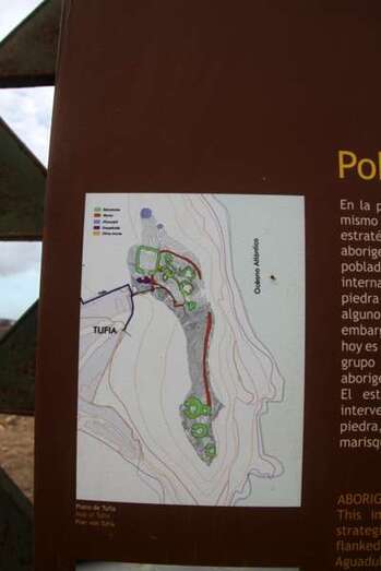 Con las debidas recomendaciones que hay que guardar durante la visita en una tarde gris y ventosa a las 18:30 hs, se inicia el recorrido con una reseña histórica de estos poblados, características de las estructuras, ubicaciones, y construcciones de los hábitats, empleo de materiales, espacios y usos, almogarén, tagoror, cenobios, ritos funerarios, necrópolis, agrupaciones tumulares, defensas de ataques, protección de elementos naturales, lluvia, vientos, etc. Centros dedicados al transcurso de sus ocupaciones y economías basadas en la agricultura cerealista, ganadería, pesca, marisqueo, uso de materias primas para alfarería, cerámicas, palma, tejidos a partir de fibras, pieles, cueros, la utilización del mocán y palmera para maderas, instrumentos de piedra, para molinos circulares, etc. Ejemplo de materiales y sus usos que se exhiben en el Museo Canario de Las Palmas de Gran Canaria.
