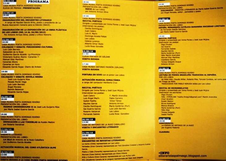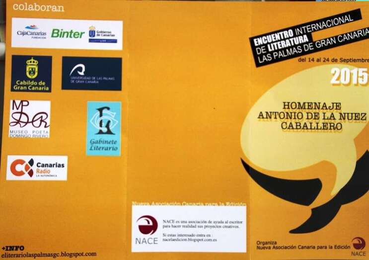 Días atrás tuvo lugar en el Museo Poeta Domingo Rivero la presentación en rueda de prensa el programa del Encuentro Internacional de Literatura que se celebraría en Las Palmas de Gran Canaria del 14 al 24 de septiembre de 2015. Encuentro que organizó Nueva Asociación Canaria para la Edición (NACE) con la colaboración del Museo Poeta Domingo Rivero, el Cabildo de Gran Canaria, Universidad de Las Palmas de Gran Canaria, Gabinete Literario, Caja Canarias Fundación, Binter, Gobierno de Canarias-Canarias Crea- Canarias Radio La Autonómica.