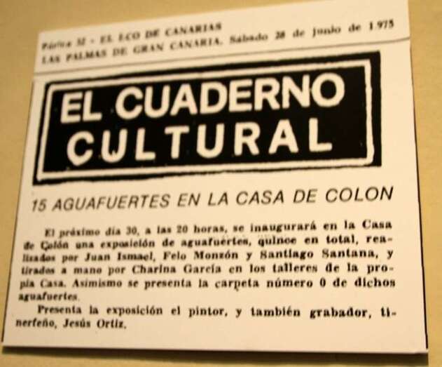 Cuando se cumplen 40 años desde que el Taller de Grabado de la Casa de Colón, en 1975, reunió a tres de los más importantes artistas de Canarias en una misma carpeta gráfica. Concebido como centro de producción y enseñanza, el Taller, que desarrolló su actividad en la Casa de Colón hasta la década de 1990 y hoy se encuentra en Tafira, se convirtió en excepcional lugar de trabajo y encuentro para artistas canarios y foráneos, como Rudolf Ackermann, Dimitri Papagueorgiu, Uwe Grumann, Alberto Manrique, César Mihalic, Jane Millares, Miró Mainou y Charina García, entre otros.