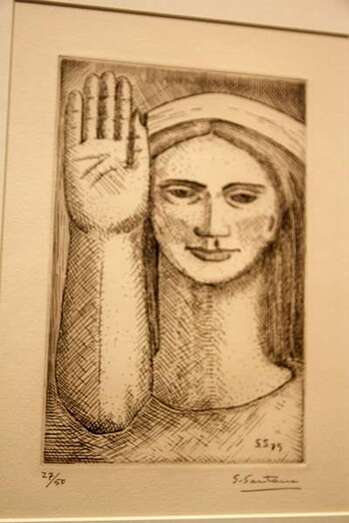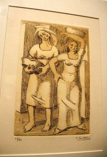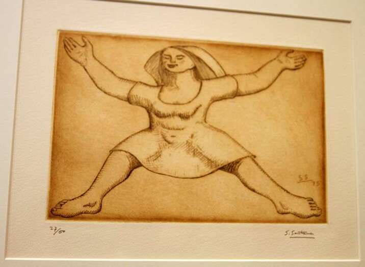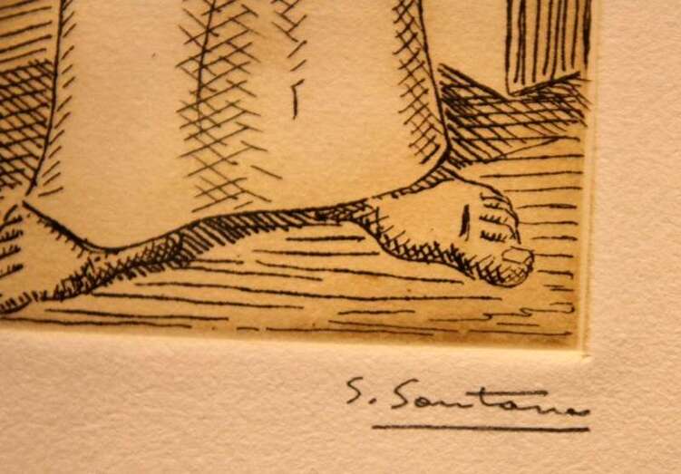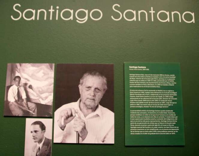 Santiago Santana ofrece por su parte una visión muralista de los personajes, con anatomías rotundas, cuasi arquitectónicas, que llenan por completo cada ángulo de la obra y cuyo aspecto sosegado y ausente se distancia de la dureza de los rostros de Monzón. Sus imágenes (cada uno diseñó cinco estampas que reflejaban las principales características de sus respectivas trayectorias artísticas) recrean el imaginario del archipiélago canario, compuesto por el mar, las barcas, los cardones, la arquitectura de los riscos, la tierra, las mantillas, las palmeras o los volcanes, en un recorrido que irremediablemente conduce hasta las islas.