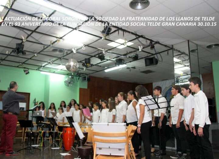 Con motivo de los actos que conmemoran el 93 Aniversario de la fundación de la Sociedad Recreativa y Cultural La Fraternidad de Los Llanos de Telde, la noche del viernes 30 de octubre la Coral infantil Soront que dirige Gustavo Sarmiento Peñate, de la Escuela Municipal de Música de Telde, perteneciente a la Escuela de Folclore, ofreció un concierto con un repertorio muy diverso ya que incluyeron próximos a las actuaciones de Navidad temas de villancicos que en las actuaciones irán presentando y ofreciendo dentro de su repertorio coral.
