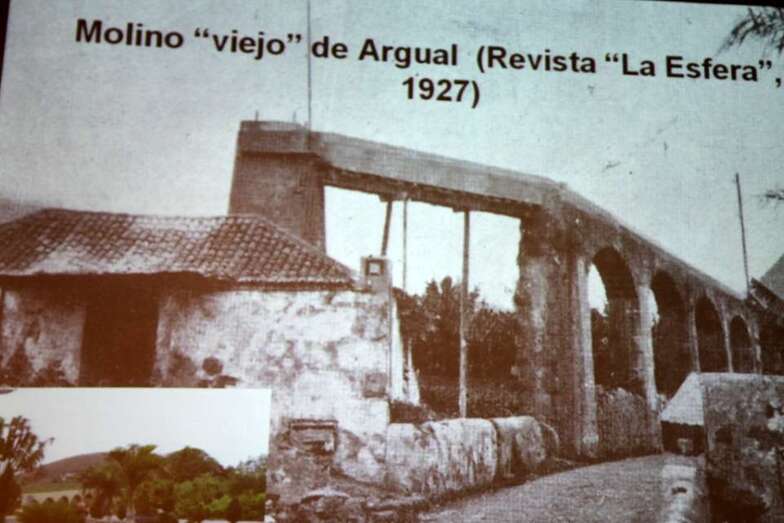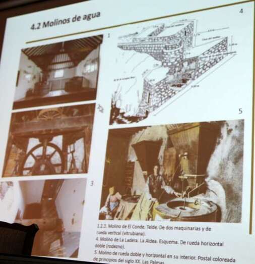 El ingeniero Fernando Ojeda Rodríguez explica el funcionamiento y la principal fuente de energía mediante el caudal de aguas de la Heredad de la Vega Mayor de Telde que en su recorrido después de atravesar acequias madres, cantoneras, llegan hasta las casetas de control y medición de aguas, como la actual Casa del Agua ubicada frente al Molino del Conde, y la entrada en el propio Molino accionando el eje que movía las ruedas para poner en movimiento las piedras de las moliendas, así como otros elementos mecánicos empleados posteriormente para accionar los mecanismos.