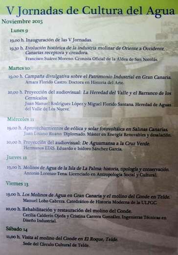 En la mañana del sábado 14 se realiza una visita a las instalaciones del emblemático Molino del Conde de la calle de El Roque, edificado entre 1841-1846 por el Condado de la Vega Grande de Guadalupe. Acto que convocó a asistentes a las conferencias de las Jornadas, en este último acto de las mismas, en el Molino del Conde, actual sede del Círculo Cultural de Telde. A las 11.00 horas la presidenta del Círculo Cultural, Lucana Falcón León da la bienvenida y previo al inicio de la exposición historiográfica del Molino se guarda un minuto de silencio por las víctimas del atentado terrorista en París. Se recita el poema denominado Gofio, autoría del escritor y poeta teldense Julio Pérez Tejera, como el producto final y básico de la alimentación en Canarias, gofio que comercializado en bolsas fueron cedidas por el Molino de Fuego de Telde, a disposición de los visitantes, resultado de toda la ingeniería aplicada durante siglos a la molienda en sus diversas evoluciones hidráulicas industriales de molinería, que se han expuesto en los ciclos de las V Jornadas de Cultura del Agua 2015.