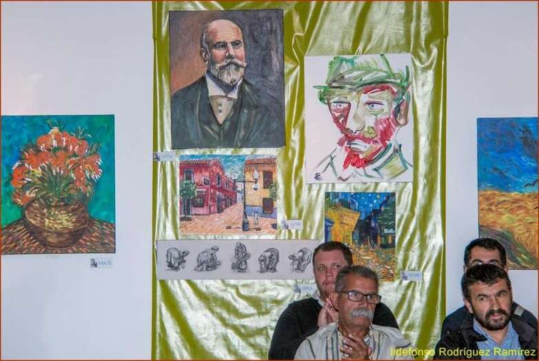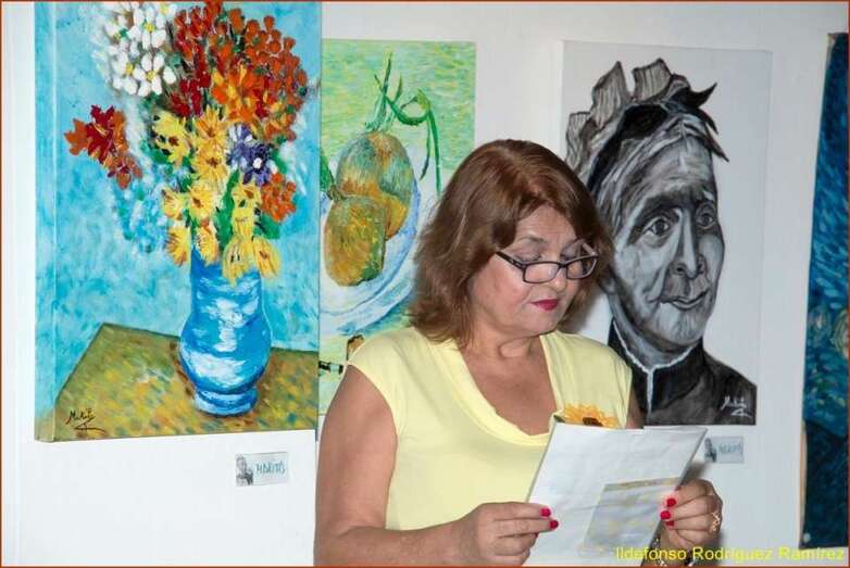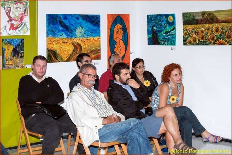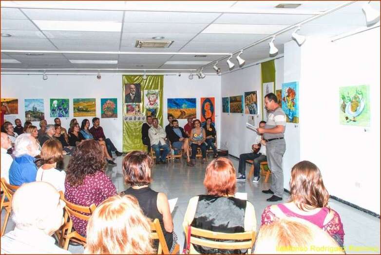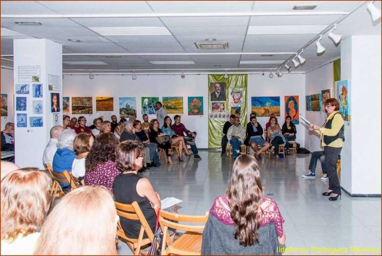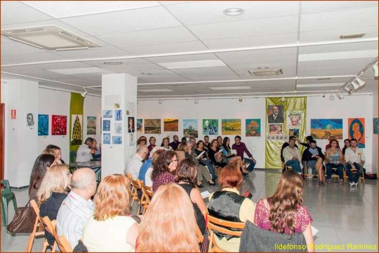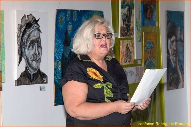 La escritora y poeta Mari Carmen Ramos Henríquez, presentadora y coordinadora del acto inicia su intervención con el saludo y agradecimiento al público presente en esta muestra dedicada a Van Gogh, una exposición colectiva que ha cosechado un éxito extraordinario por la numerosa presencia de pintores cuyas señas de identidad artísticas han significado para esta muestra el paso desde la Escuela taller, el conocimiento del gran pintor holandés, indagar en su vital experiencia personal, desarrollo y consecuencias de su carácter y la gran obra final, la numerosa obra del Van Gogh el gran desconocido de su época, y posteriormente, el genio, el gran maestro del color y del postimpresionismo de todos los tiempos.