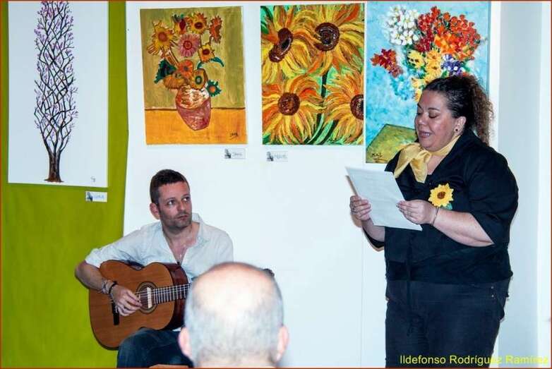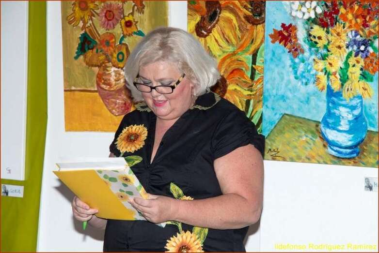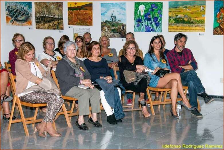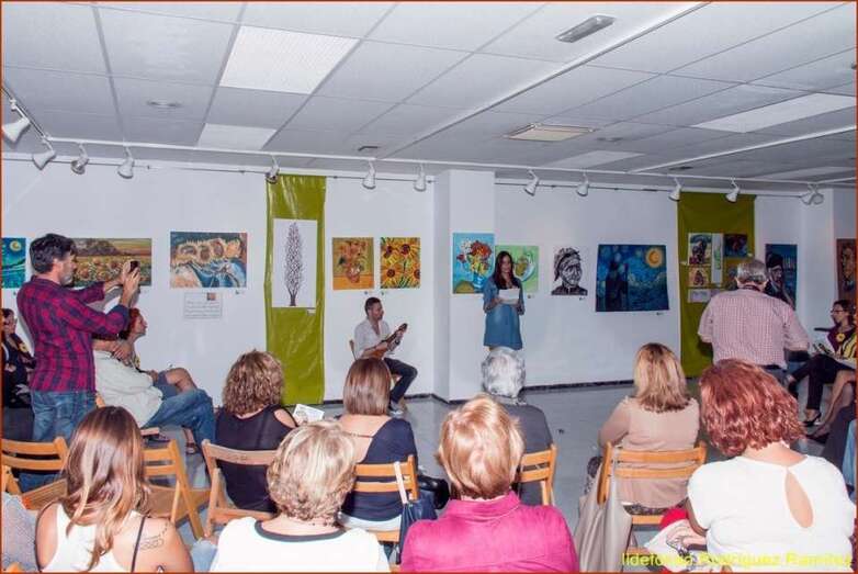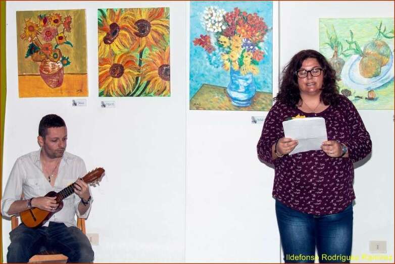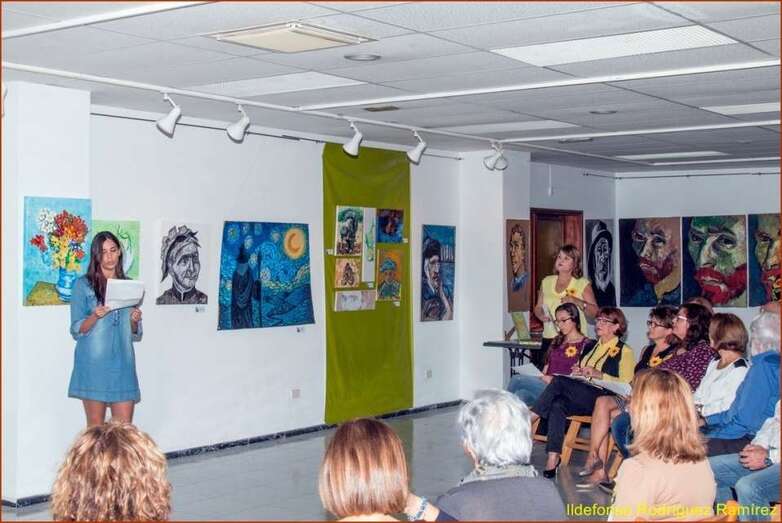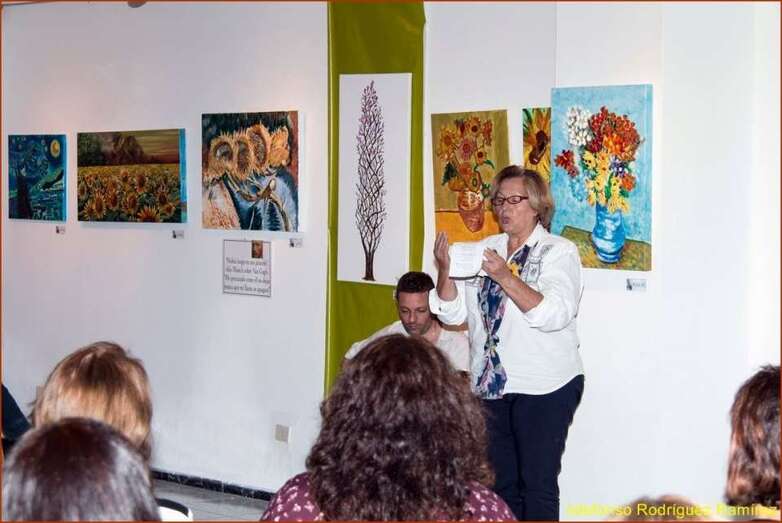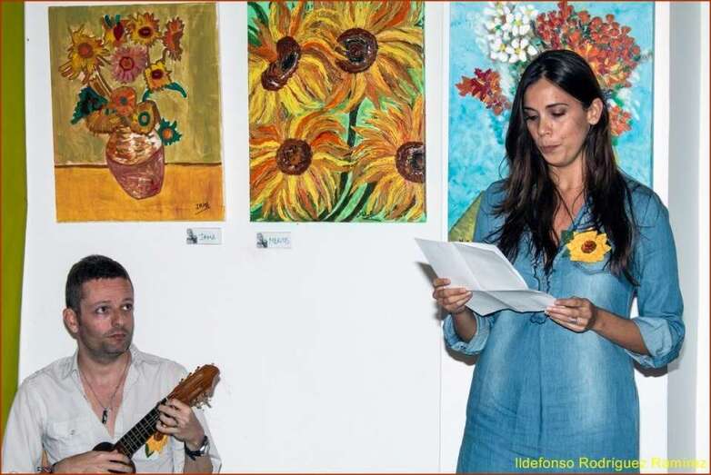 Juana María Ruiz Suárez, poeta, escritora, presidenta de la Asociación Isadora Duncan, recita el poema de su autoría Los girasoles, escrito en uno de los Talleres de Literatura, editado en su obra literaria. Una de las alumnas que participan en la exposición, Susi Sánchez expone la narración biográfica de Van Gogh, ampliando la información documental que sobre el artista, el maestro, el genio, se ha ido exponiendo antes de cada poema en referencia a su vida y obra. Finalizada su intervención da paso a la poeta Paqui Santana que recita el poema El fuego de sus pinceles.