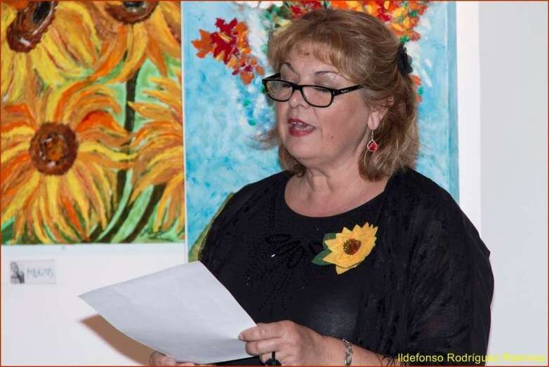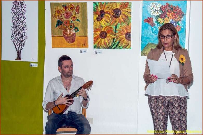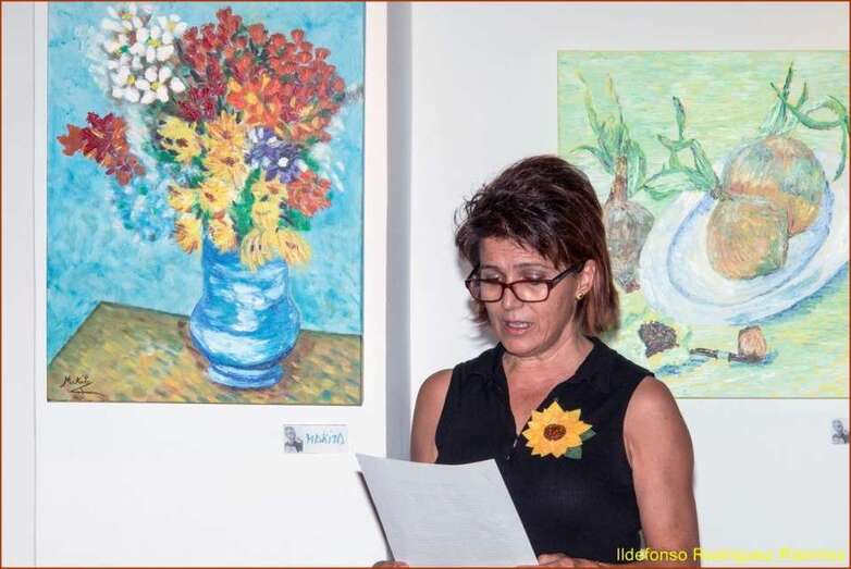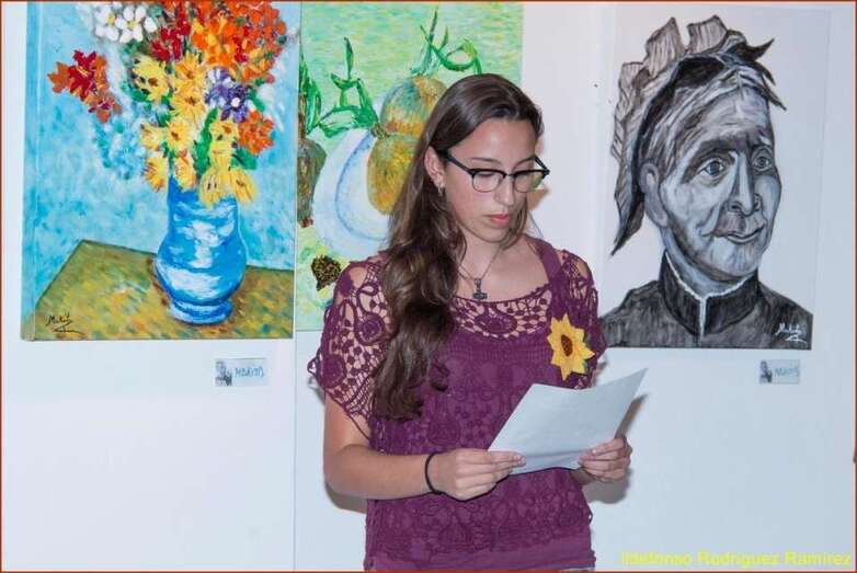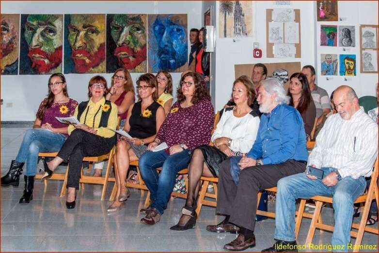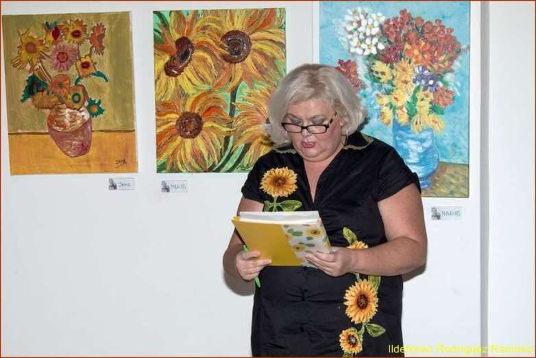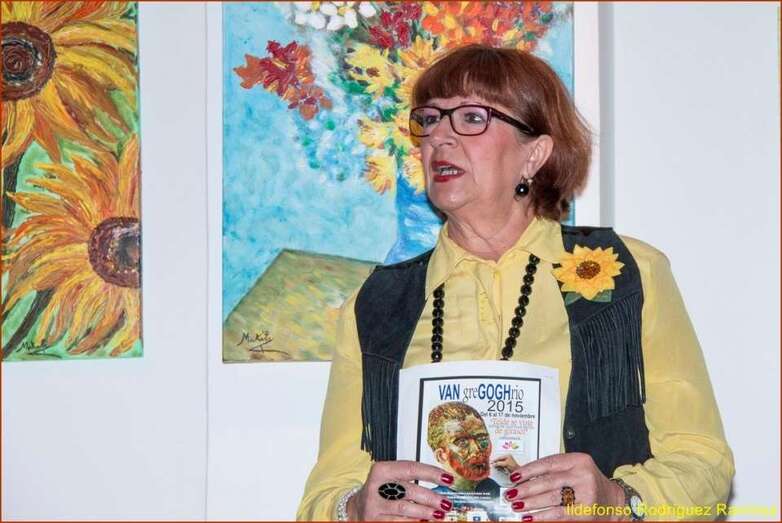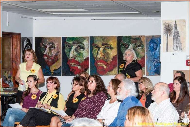 Juana María Ruiz Suárez, poeta, escritora, presidenta de la Asociación Isadora Duncan, recita el poema de su autoría Los girasoles, escrito en uno de los Talleres de Literatura, editado en su obra literaria. Una de las alumnas que participan en la exposición, Susi Sánchez expone la narración biográfica de Van Gogh, ampliando la información documental que sobre el artista, el maestro, el genio, se ha ido exponiendo antes de cada poema en referencia a su vida y obra. Finalizada su intervención da paso a la poeta Paqui Santana que recita el poema El fuego de sus pinceles.