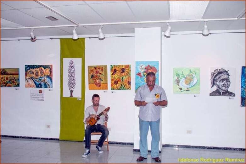 El poeta, escritor y educador Guillermo Robaina Montero, lee un texto sobre el genio del gran Van Gogh elaborado por el escritor y poeta teldense Julio Pérez Tejera. Robaina Montero recita el poema de su autoría La Locura. La profesora Juani López en un seguimiento del conocimiento del pintor, glosa en una descripción biográfica detallada secuencias de la vida del artista. Seguidamente la intervención musical del cantautor Nau Casañas, interpreta a la guitara un sugerente y bella composición musical de su autoría….le pongo amarillo a las noches en vela, desde la ventana que da al corazón…