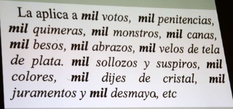 El número mil tiene un especial atractivo para el autor de El Quijote. "Es una cantidad que utiliza como comodín en un buen número de situaciones. Quizá sea debido a que se trata de los que llamamos, coloquialmente, “una cifra redonda”. En pocos casos está utilizada para expresar mil unidades sino que la mayoría de las veces es usada para enfatizar la presencia en exceso de alguna virtud o defecto. Así, la vemos cuando dice Sancho: ... de tal manera me duele el cuerpo, que me parece que me han dado mil palos o cuando vio el rostro del Bachiller Carrasco y comenzó a hacerse mil cruces y a santiguarse otras tantas. En la historia de Cardenio la vemos aplicada a elementos de tipo más espiritual e intangible, cuando dice: ... y ella me lo confirmó con mil juramentos y mil desmayos”, indicó Balbuena