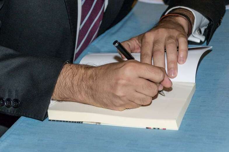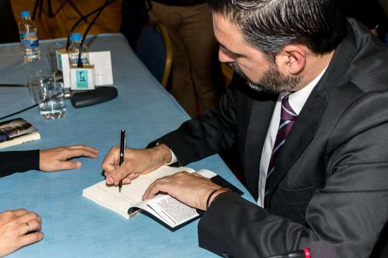 El autor de origen teldense firma un ejemplar de su última novela después de su presentación (Foto José Fco. Fernández Belda) El autor de origen teldense firma un ejemplar de su última novela después de su presentación (Foto José Fco. Fernández Belda)