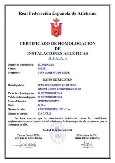 Telde.- La Real Federación Española de Atletismo (RFEA) emitió este viernes el certificado de homologación de las pistas de atletismo de El Hornillo, documento que ya está en manos de la Concejalía de Actividad Física y Deportes dirigida por el edil Pablo Rodríguez.