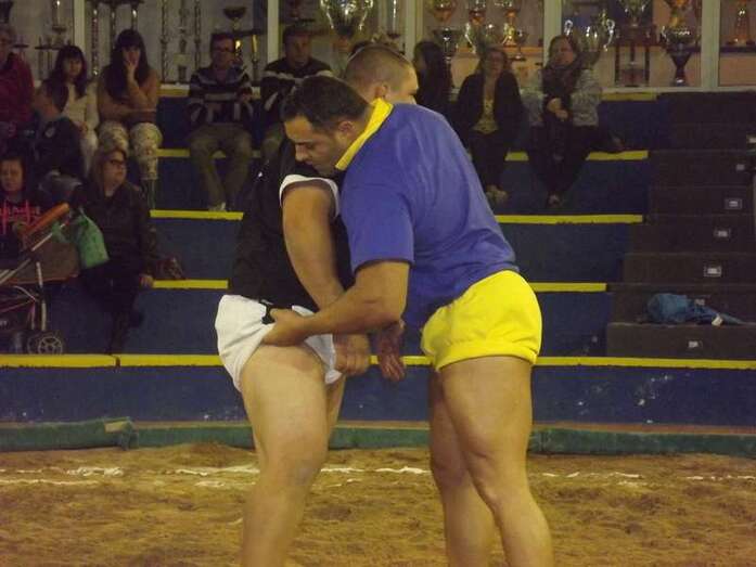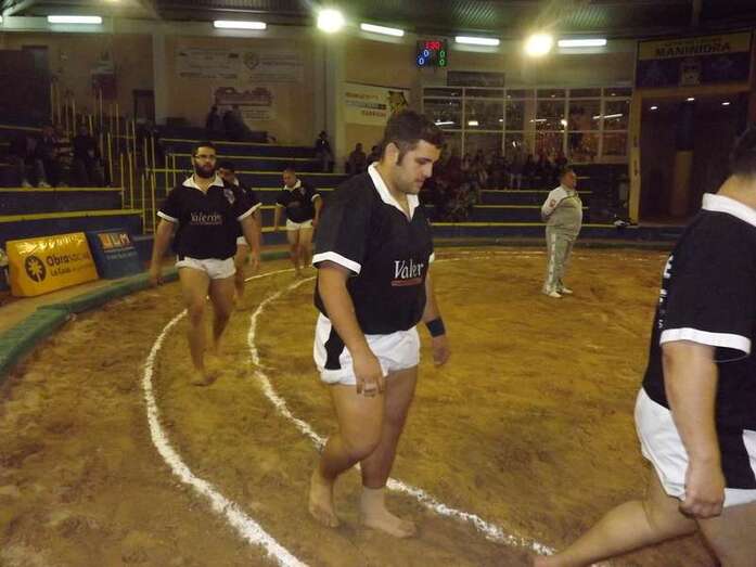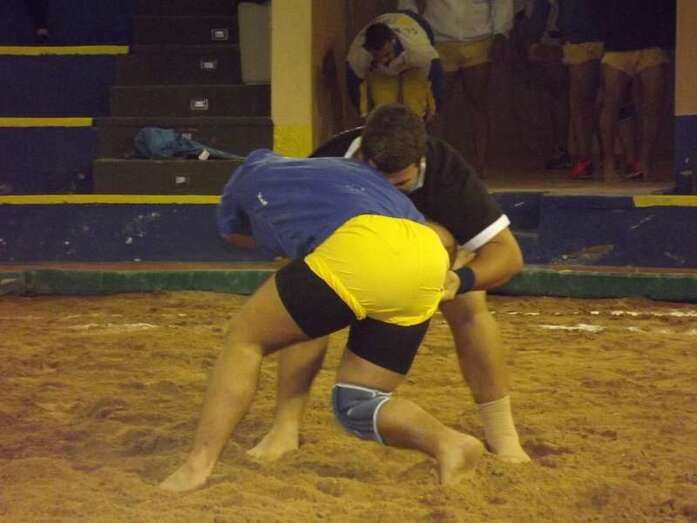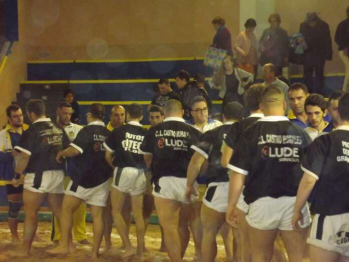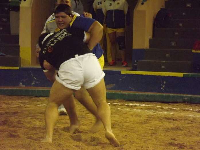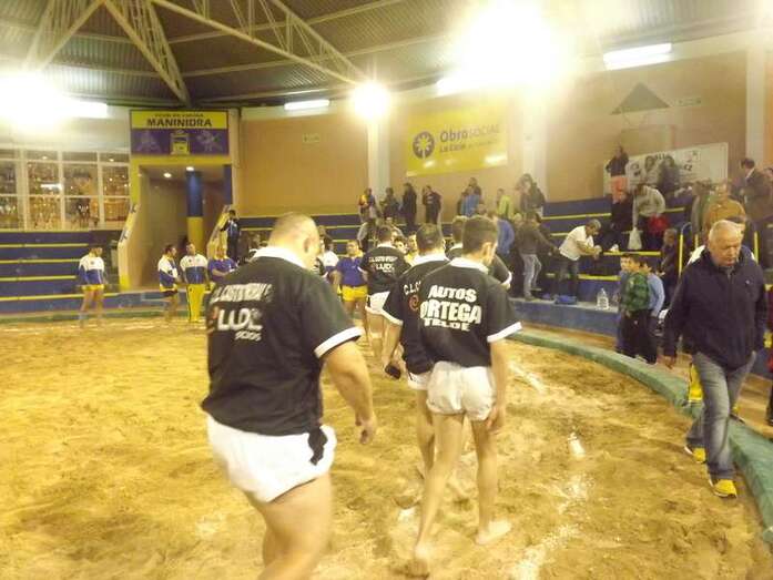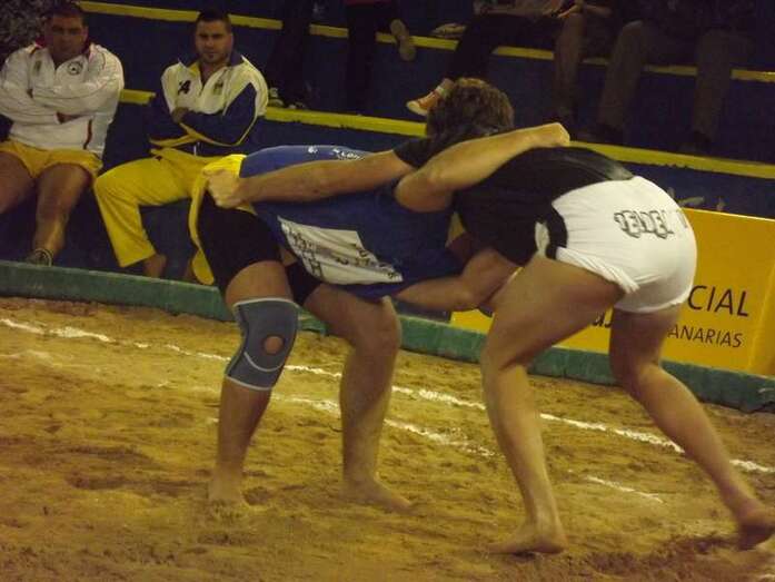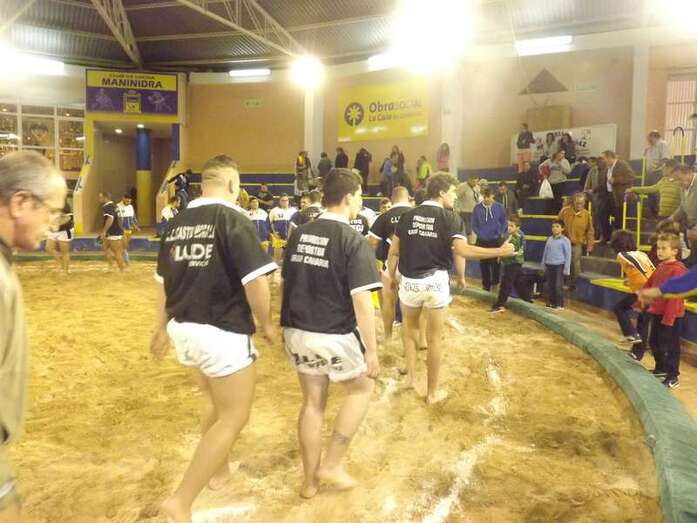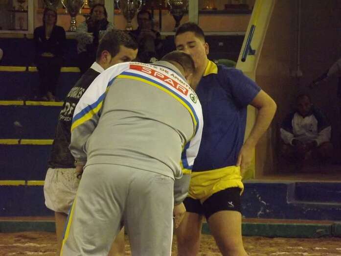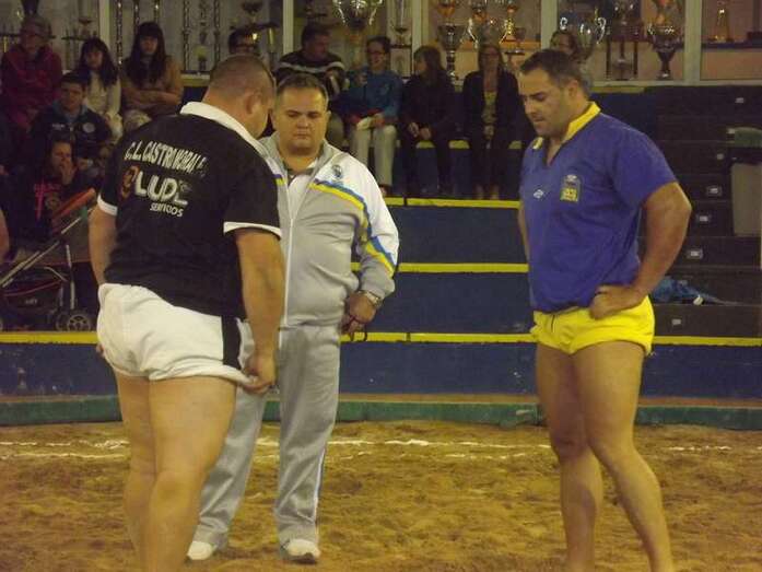 Entonces llegó la agarrada de la noche entre los puntales A y C Ricardo Rodríguez, ‘Medianito IV’, y Jonay López. En la primera, a López se le fue la mano de la cintura y eso lo aprovechó al máximo artillero local para poner en ventaja a su equipo. En la segunda, el ‘C’ teldense llevó la agarrada hasta el bocinazo final. Durante los 1:30, el teldense buscó levantar a su contrincante para después voltearle, cosa que no pudo debido a la fuerza física del ingéniense.