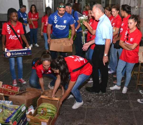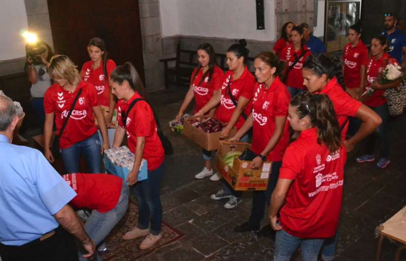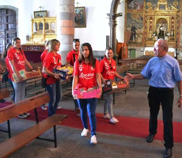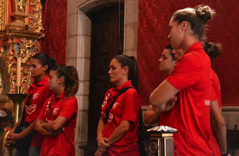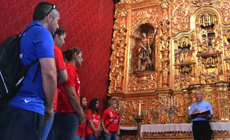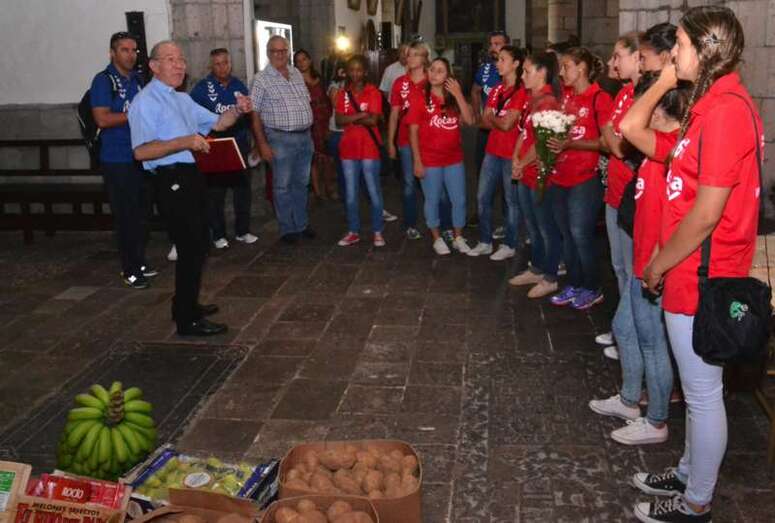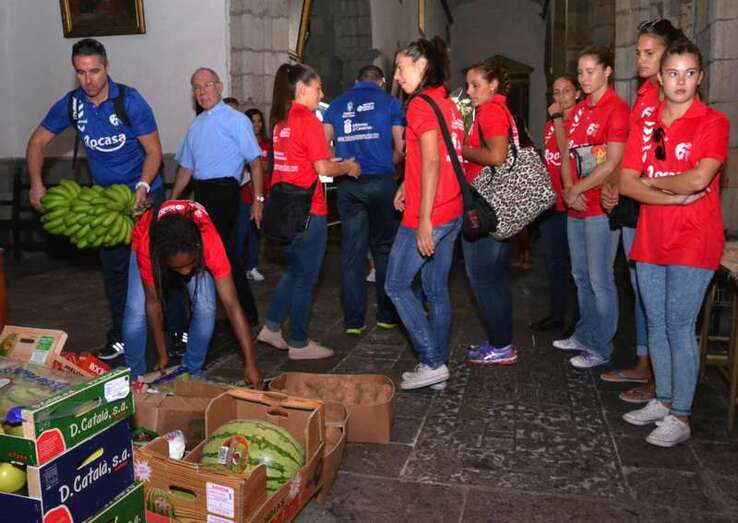 Telde.- Las jugadoras y el cuerpo técnico del Rocasa Gran Canaria ACE se encomendaron este martes al San Cristo de Telde durante la visita que el conjunto local realizó a la Basílica Menor de San Juan. Un acto en el que entregaron una ofrenda de alimentos y flores, y recibieron la bendición del párroco del templo, José María Cabrera.