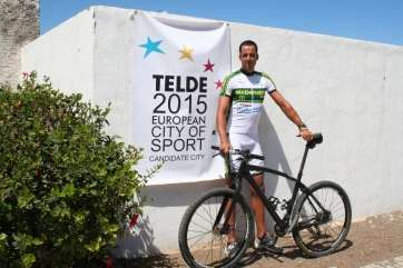 Telde.- El vigente Campeón de Canarias de Fondo en Carretera en Máster 30 Francis Pérez, que corre bajo los colores del Mc Donald´s Telde-Campus Costaverano, antes de partir hacia Huelva para participar en los Campeonatos de España de BTT- Maratón, quiso mostrar su apoyo a la propuesta impulsada por el área de Deportes que coordina el concejal Pablo Rodríguez, para que Telde se convierta el próximo año en Ciudad Europea del Deporte.