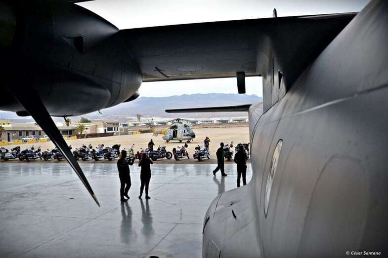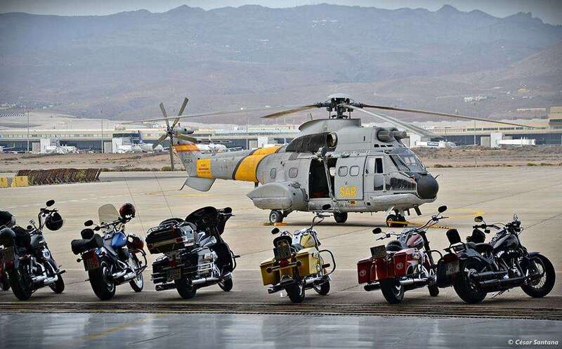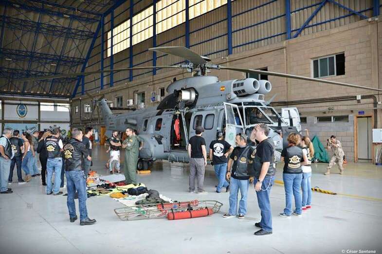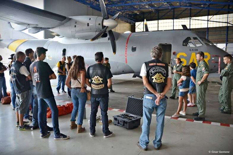 Cuerpos militares escoltaron al grupo motero desde la entrada hasta el hangar del 802 Escuadrón del SAR y RCC de Canarias. Los motoristas disfrutaron de unas charlas explicativas de las labores que realizan este cuerpo de rescate y el material que utilizan para sus misiones.